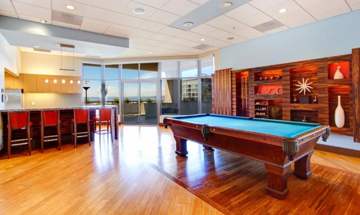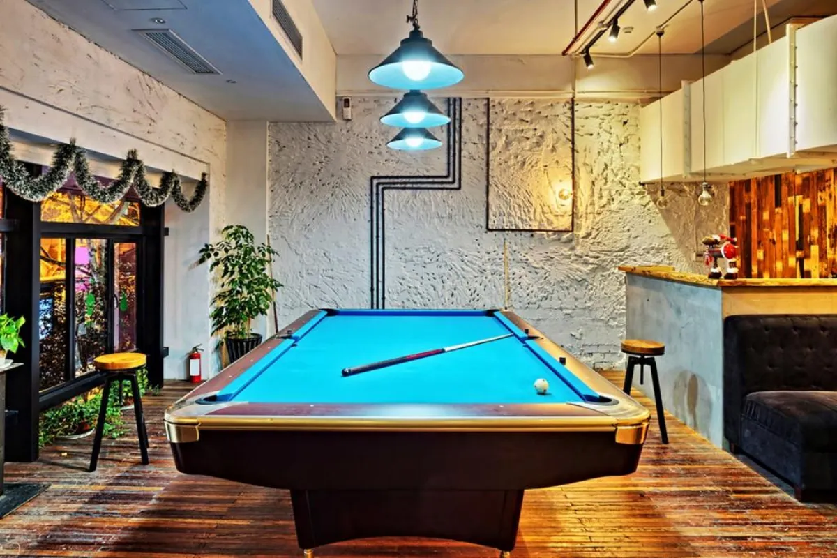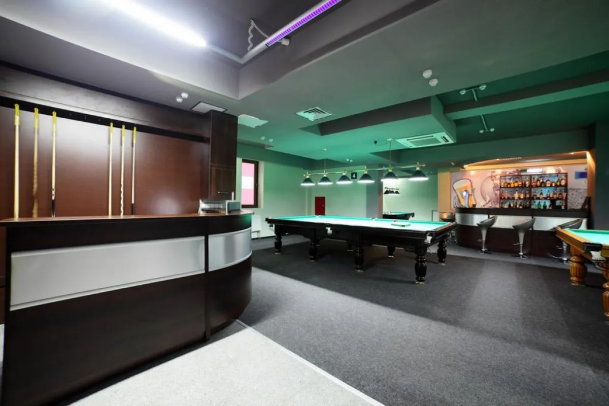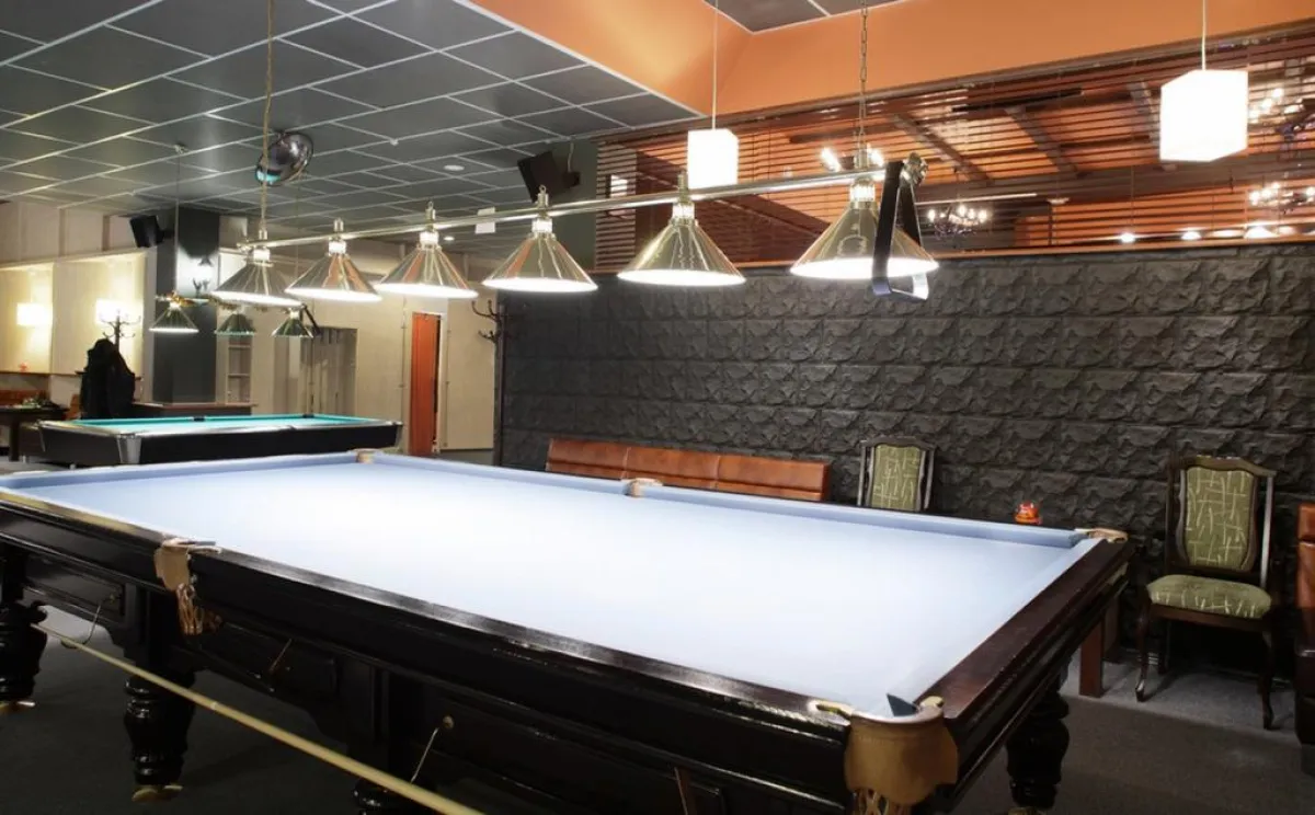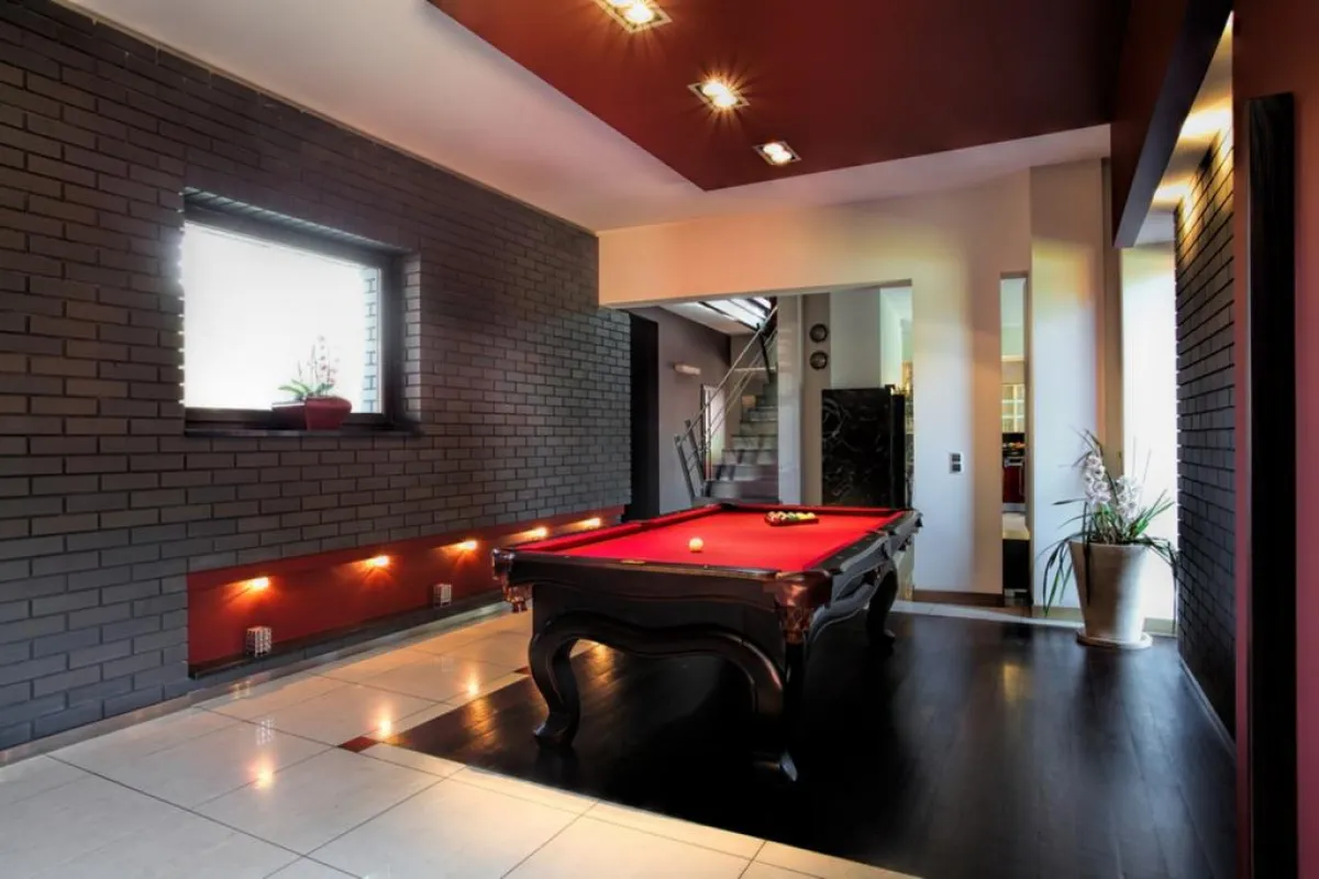 *تتوسّط طاولة الـ"بلياردو" مساحة الألعاب، مع الحرص على تأمين الحركة المريحة حولها، وتُغطّى أرضيتها بالـ"فينيل" أو الـ"باركيه". كما هي تتطلّب توجيه إضاءة كافية من السقف، عبارة عن سكّة حديد تحوي مجموعة من المصابيح، أو لمبة طويلة مستطيلة مسلّطة فوق الطاولة.