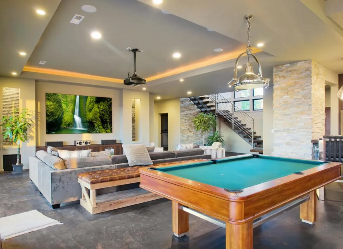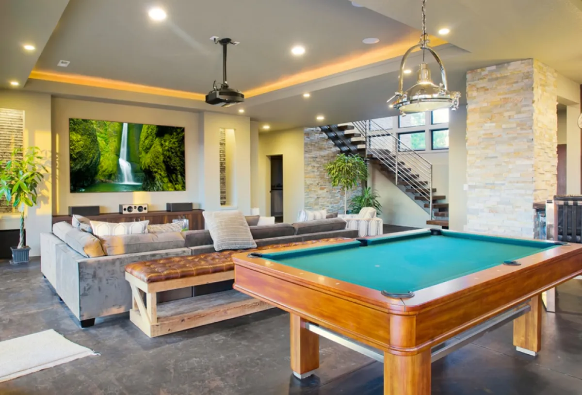* تتعدّد استخدامات مساحة الترفيه، حسب هوايات المالكين. وعمومًا، يمكن تقسيمها إلى أجزاء مفتوحة على بعضها، لتضمّ ركنًا للياقة البدنية يحوي المعدّات اللازمة، وآخر لمشاهدة الأفلام، وفسحة تحوي الألعاب كطاولة الـ"بلياردو"، فضلًا عن جلسة مخصّصة للحفلات مُزوّدة بمنصة للرقص.