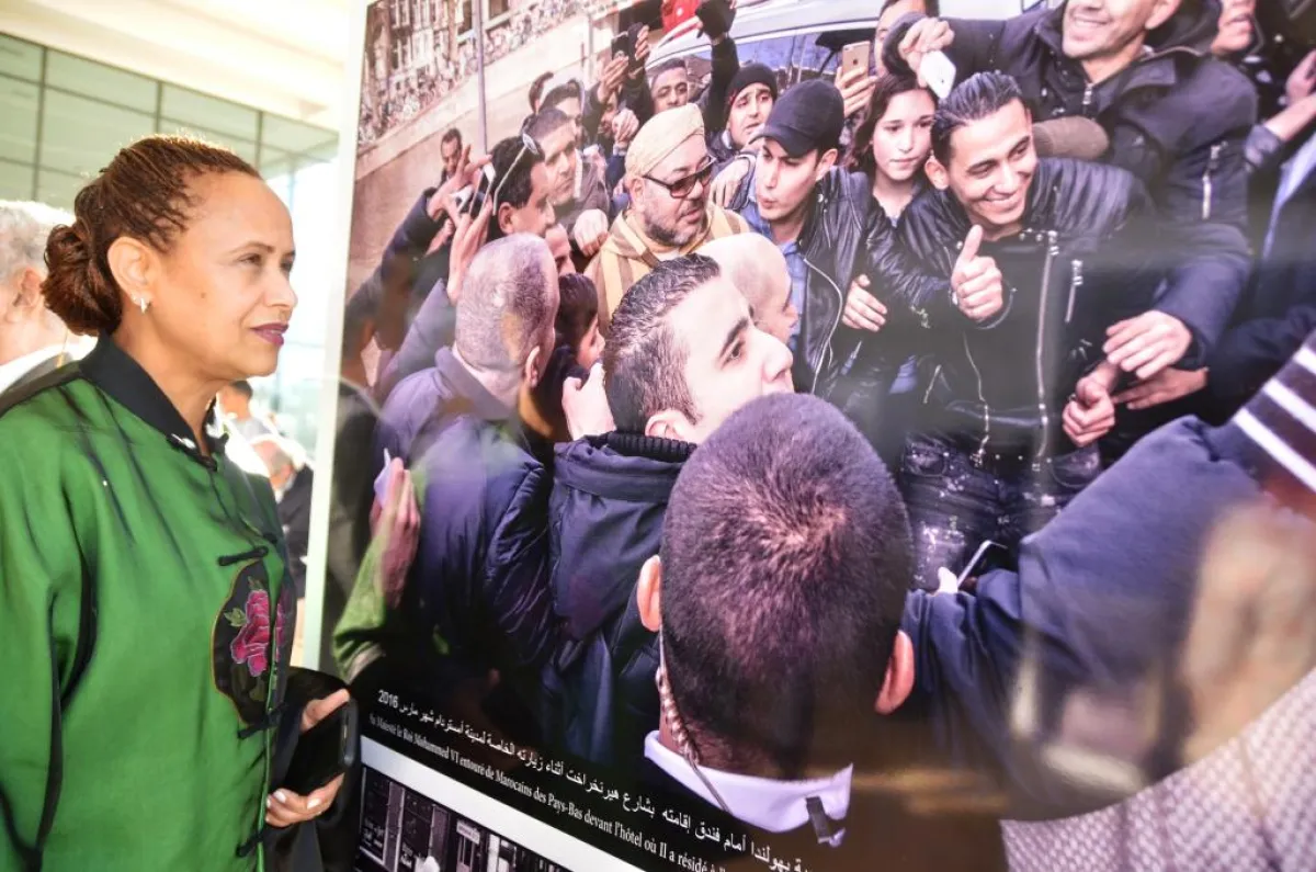 إحدى المهاجرات المغربيات تتطلع إلى صورة العاهل المغربي مع الجالية المغربية في هولندا