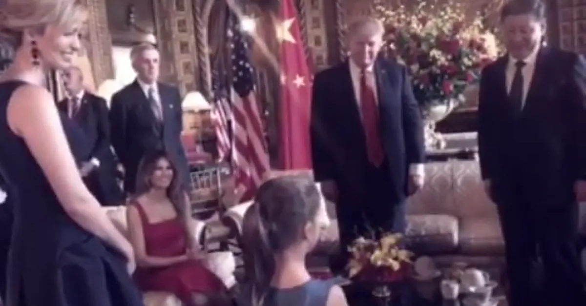 وتظهر في الفيديو ابنة إيفانكا، البالغة من العمر خمس سنوات «أرابيلا» وهي تهدي الرئيس الصيني «شي جين بينغ» وزوجته «بنغ لي يوان» أغنية صينية قصيرة، فيما رحبت والدتها قائلة: «نريدك أن تشعر كما لو أنك في بيتك»، وذلك أثناء استضافتهما في المنتجع الخاص بترامب في ولاية فلوريدا الأمريكية.