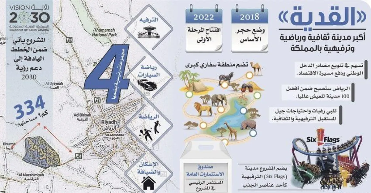 أعلن صاحب السمو الملكي الأمير محمد بن سلمان بن عبدالعزيز آل سعود، ولي ولي العهد رئيس مجلس إدارة صندوق الاستثمارات العامة، عن إطلاق مشروع أكبر مدينة ثقافية ورياضية وترفيهية نوعية في السعودية، التي تعد الأولى من نوعها في العالم، وذلك بمنطقة (القدية) جنوب غرب العاصمة الرياض، بمساحة تبلغ 334 كيلومتراً مربعاً، بما في ذلك منطقة سفاري كبرى.