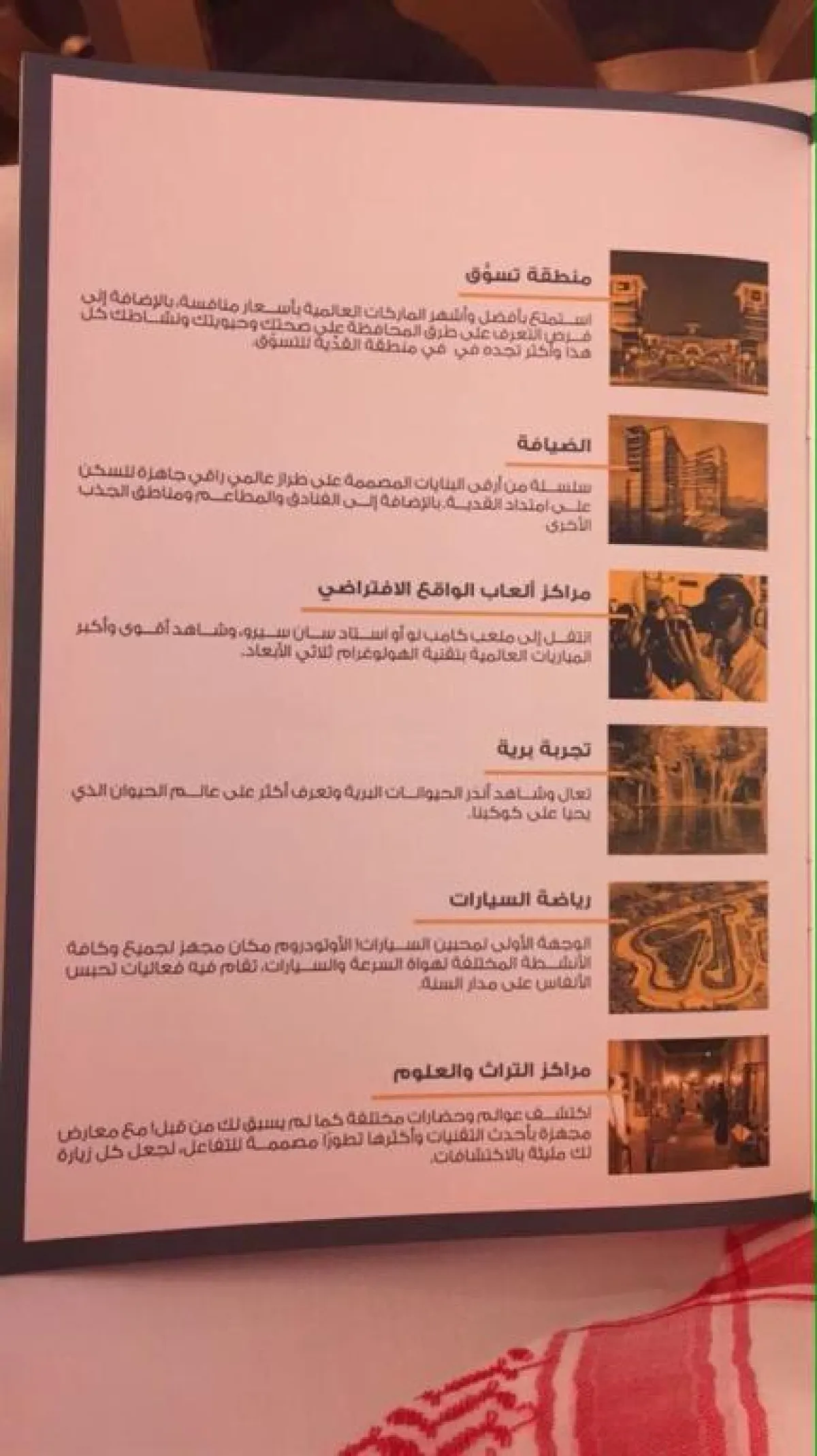 ومن المتوقع أن يضم مشروع مدينة (Six Flags) الترفيهية أربع مجموعات رئيسية، هي «الترفيه، رياضة السيارات، الرياضة والإسكان والضيافة»، وسوف يوفر المشروع أيضاً أنشطة رياضية متميزة، تدعم طاقات الشباب، وتحفزهم إلى التميز في المسابقات الرياضية الإقليمية والعالمية، إضافة إلى دوره في فتح مجالات أرحب وآفاق أوسع لمحبي الرحلات البرية وعشاق المناظر الطبيعية، ونشاطات الهواء الطلق، بالإضافة، إلى سلسلة من أرقى البنايات المعمارية والفنادق بأفضل المعايير والمواصفات العالمية الراقية بإطلالة ساحرة وتصميم أنيق؛ لتوفير المزيد من الراحة والانسجام للزوار، كما يزدان المشروع بتوافر أشهر المطاعم والماركات العالمية للاستمتاع بأجمل أوقات التسوق، وعالم من المغامرات.