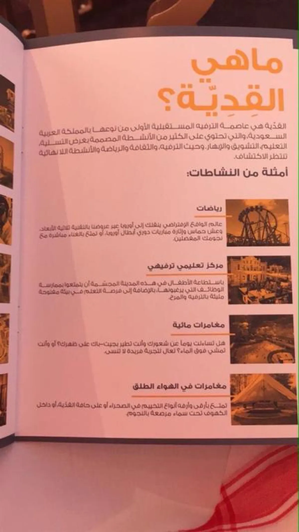 ووفقاً لـ«واس»، رأى ولي ولي العهد أن مشروع (القدية) المقرر وضع حجر الأساس له بداية العام 2018، وافتتاح المرحلة الأولى منه في العام 2022م، سيُحدث نقلة نوعية في السعودية، ويدعم الارتقاء بمستوى الخدمات بالعاصمة الرياض؛ لتصبح واحدة ضمن أفضل 100 مدينة للعيش على مستوى العالم.
