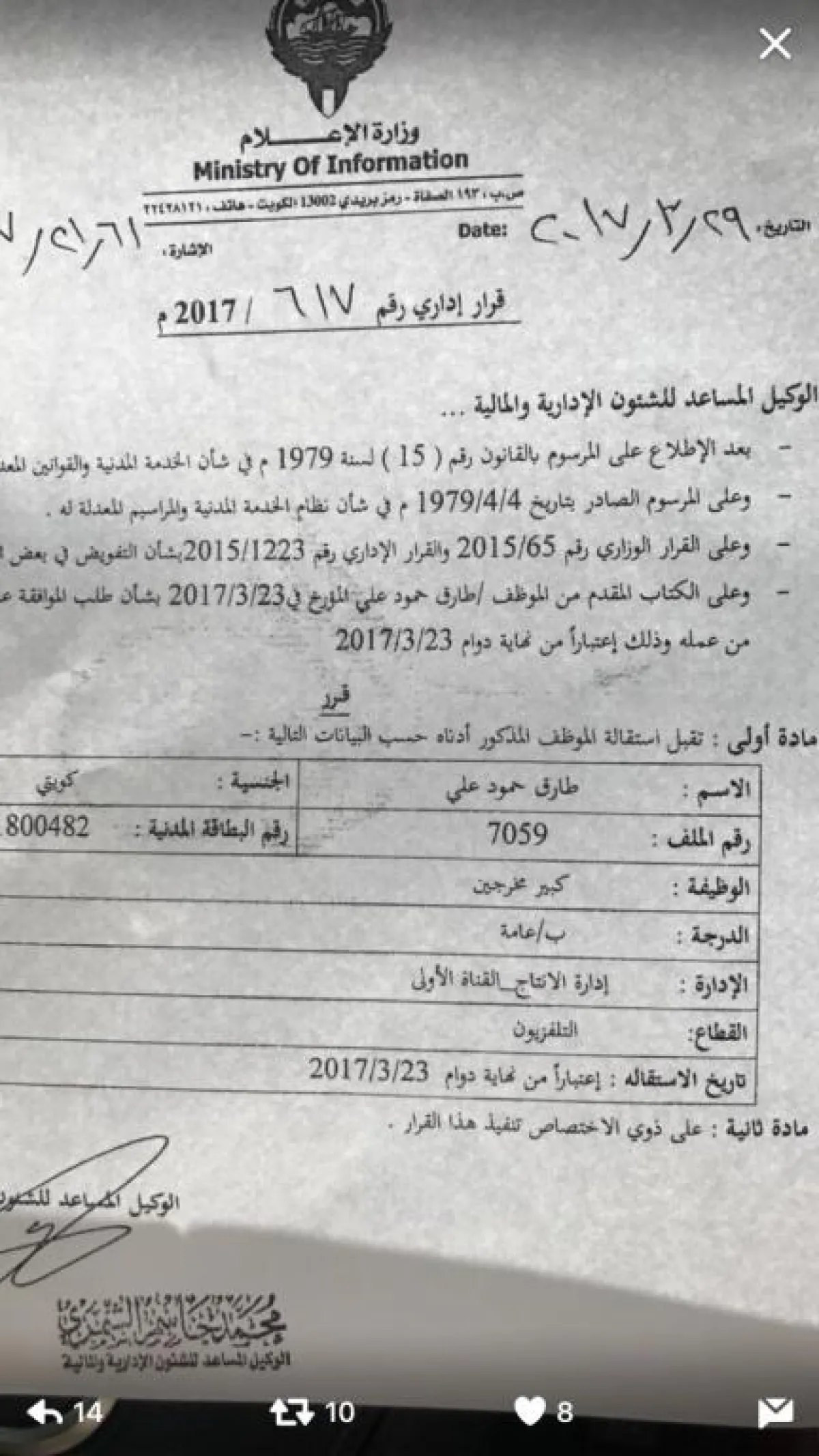 وكان «ديوان المحاسبة» الكويتي أعلن تحويل بعض العاملين بوزارة الإعلام إلى هيئة المحكمة التأديبية ومن بينهم الفنّان طارق العلي الّذي يعمل بالوزارة بوظيفة كبير المخرجين، والذي عبّر عن استيائه لهذا القرار.