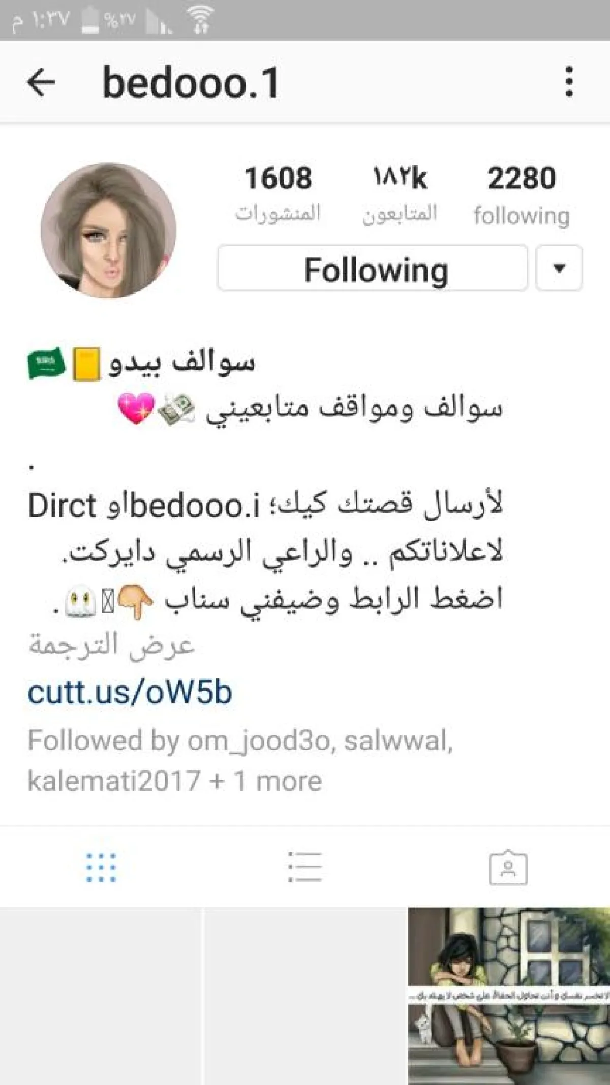 بيدو ذات الـ 29 عاماً أم لثلاثة أطفال، حاصلة على بكالوريوس تربية، قسم إعاقة سمعية، متفرغة تماماً لإدارة الحساب لاسيما أنها لم تجد وظيفة، فاضطرت أن تشغل وقتها بالحساب.