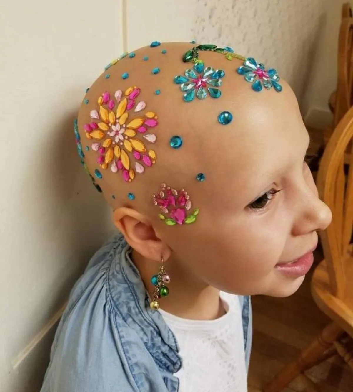 ولم يمنع سقوط شعر الطفلة «جيانسيا» وفقدانه، من رسم البسمة على وجهها، واستكمال طفولتها البريئة، واستمرار أملها في الحياة، حيث قامت بتزيين رأسها بالحبات الملونة وتجميعها بجانب بعضها لتكوين أشكال كالورود، لتثبت لمن حولها قوتها وصمودها رغم مرضها.
