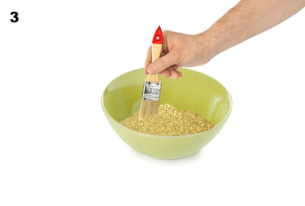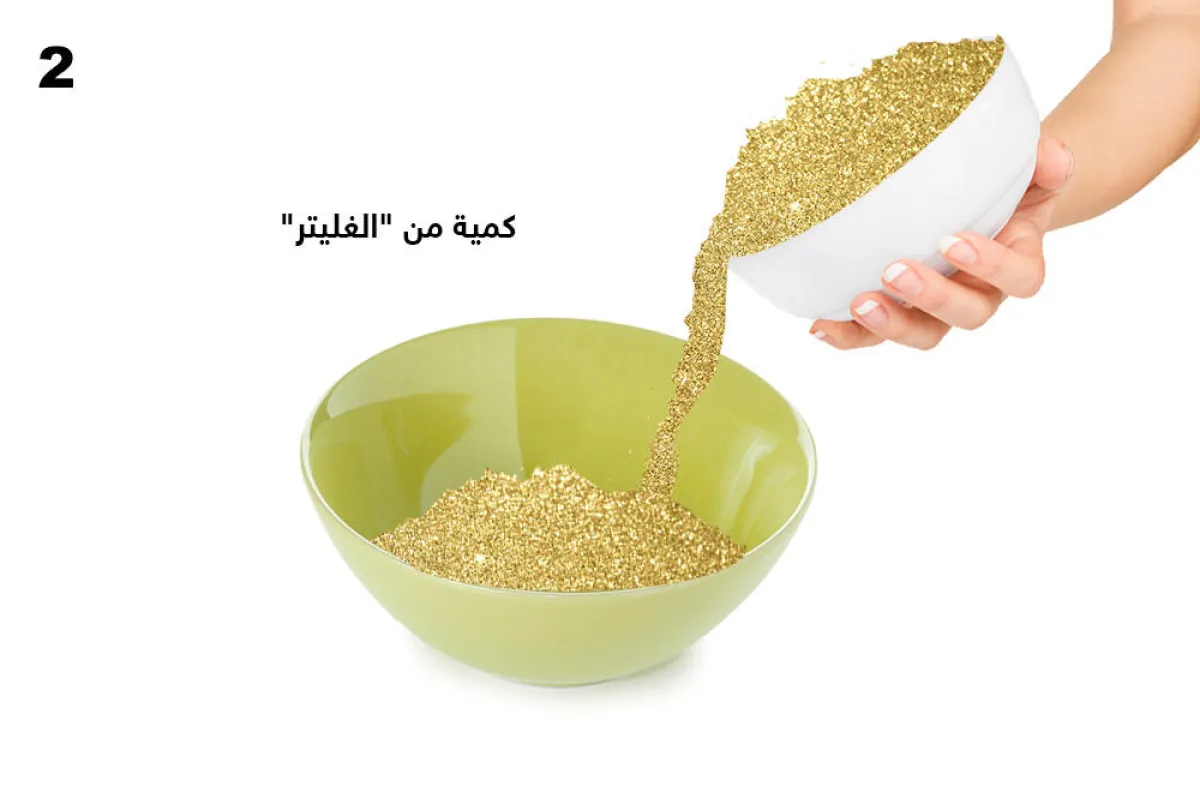2. ترشّ المواد البرّاقة (غليتر) باللون المفضّل، فوق الغري. ويُخلط المكوّنان، بواسطة فرشاة طلاء.