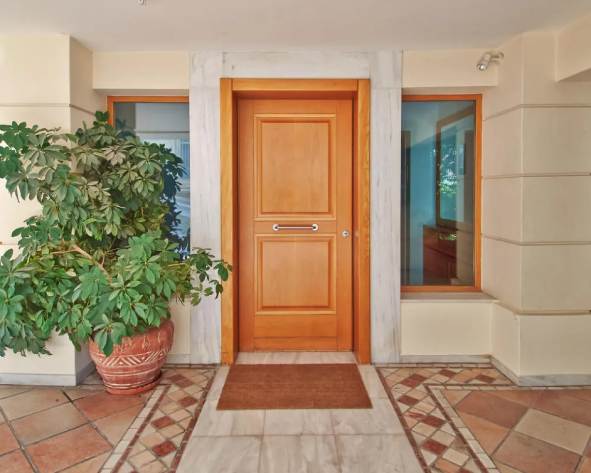 | إلى متانة باب المنزل، من الضروري أن يعكس مظهره طراز التصميم السائد في المنزل. ومن المُفضّل استخدام طلاء لمّاع له، ما يعدّ وسيلة سريعة لجعل الانطباع الأوّل مبهرًا.