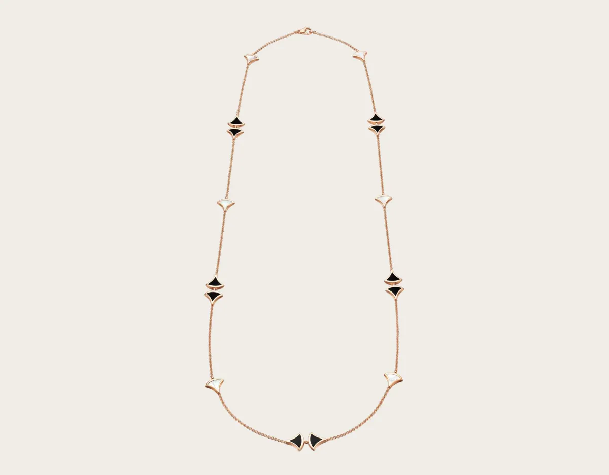 كما قدّمت دار بولغري Bulgari ضمن مجموعتها الشهيرة ديفاز دريم Diva's Dream سلسلة من الذهب الأصفر مزيّنة بأحجار عرق اللؤلؤ وبالطلاء الأسود. وهي سلسلة ذات تصميم أنثوي ساحر، يمكنك أن تتألقي بها في مختلف المناسبات والإطلالات، حتى مع الجينز وغيره من الملابس الكاجوال.