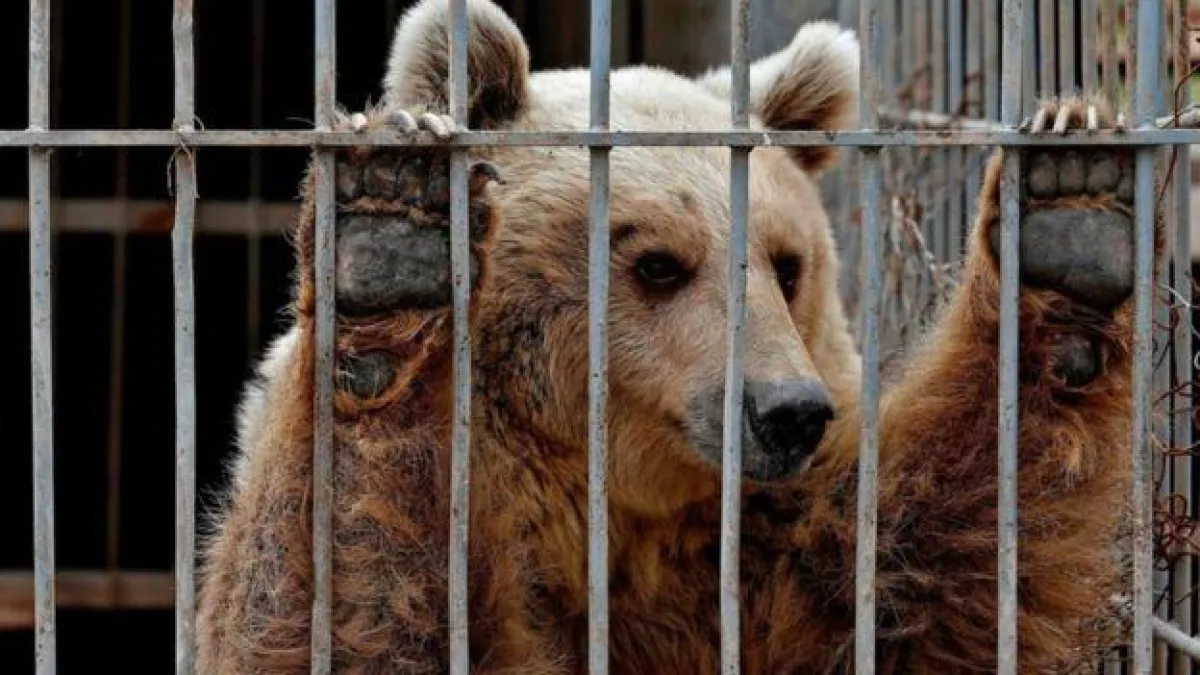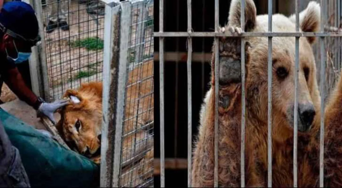 وكانا لا يزالان في قفصيهما وتُغطيهما الأوساخ والفضلات، حيث ان أُنقِذ الحيوانان الوحيدان الناجيان من حديقة الحيوانات بمدينة الموصل في ظل ظروف قاتلة تشهدها المدينة التي مزّقتها الحرب الدائرة هناك لاستعادتها من قبضة مسلحي عصابة داعش.