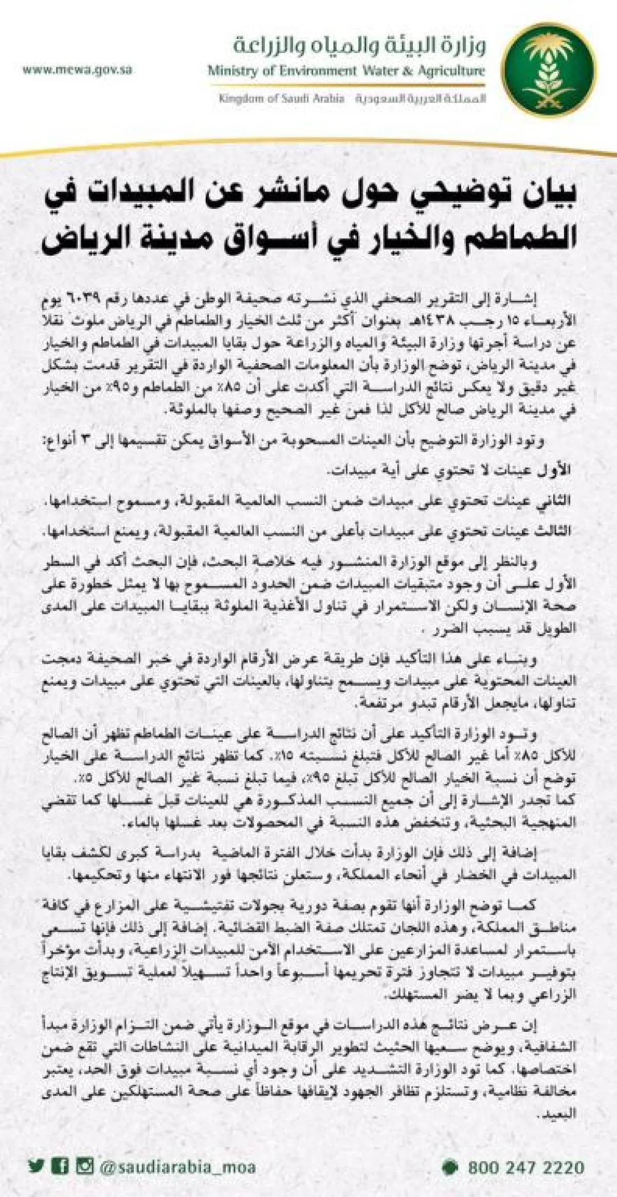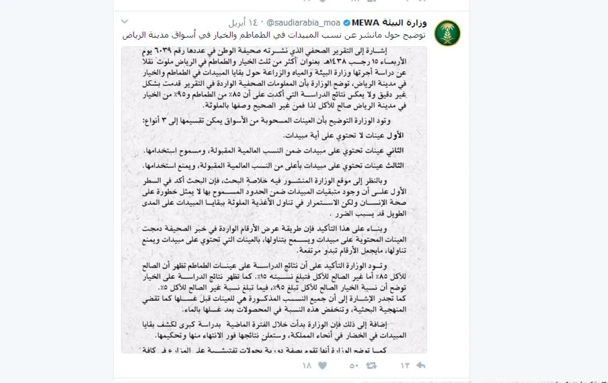 وقالت الوزارة، يوم الجمعة (14 إبريل2017) في بيانها: "إشارة إلى التقرير الصحفي الذي نشرته إحدى الصحف يوم الأربعاء 15 رجب 1438 هـ، بعنوان أكثر من ثلث الخيار والطماطم في الرياض ملوث نقلاً عن دراسة أجرتها وزارة البيئة والمياه والزراعة حول بقايا المبيدات في الطماطم والخيار في مدينة الرياض، تود الوزارة أن توضح أن المعلومات الصحفية الواردة في التقرير قُدِّمت بشكل غير دقيق ولا يعكس نتائج الدراسة التي أكدت أن 95% من الطماطم، و95% من الخيار في مدينة الرياض صالح للأكل، لذا فمن غير الصحيح وصفها بالملوثة".