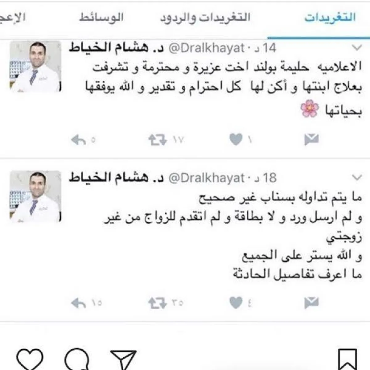ولم تُعرف الأسباب التي دفعت حليمة لفضح الطبيب على "سناب" الذي على ما يبدو فوجىء بتصرفها، فأنكر واقعة طلب يدها للزواج ونفى ما تم تداوله على سناب حليمة وكتب: "الاعلامية حليمة بولند أخت عزيزة وأحترمها وتشرفت بعلاج إبنتها وأكن لها إحترام وتقدير والله يوفقها بحياتها".