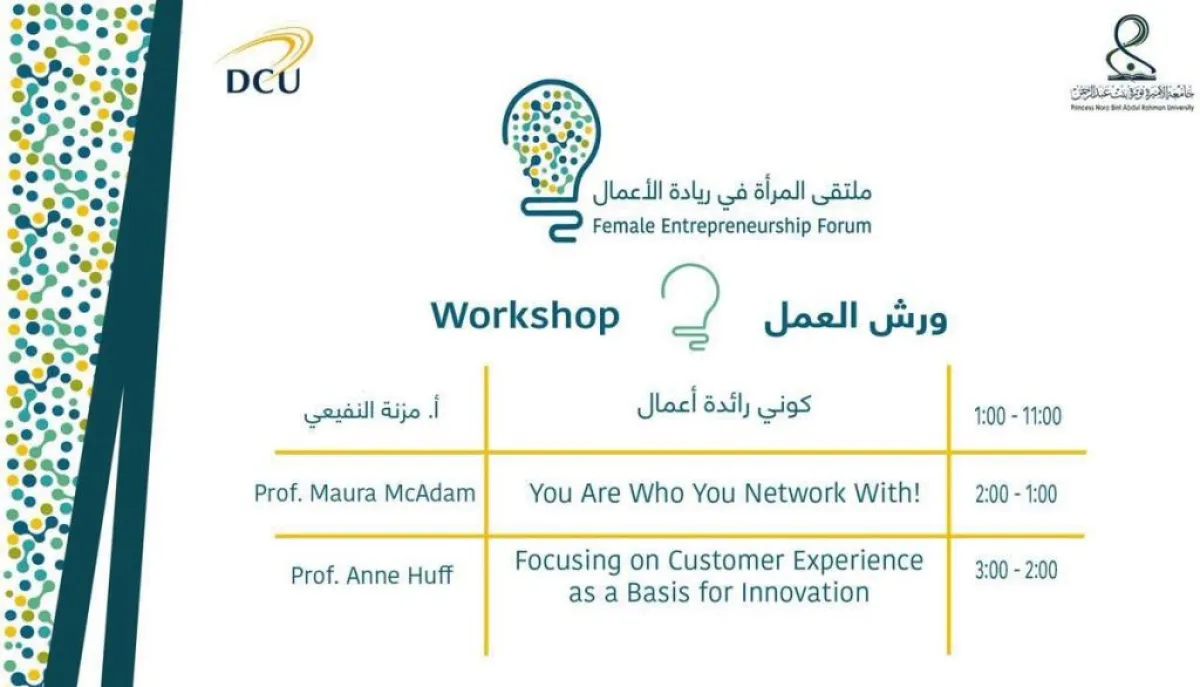 لإعداد متخصصات على مستوى عالٍ من الكفاءة ليشغلن وظائف قيادية في المنظمات، عقدت جامعة الأميرة نورة بنت عبد الرحمن، ممثلة في كلية الإدارة والأعمال، ملتقى المرأة في ريادة الأعمال، قدمه برنامج الماجستير في إدارة الأعمال بالشراكة مع جامعة مدينة دبلن (Dublin city university DCU.