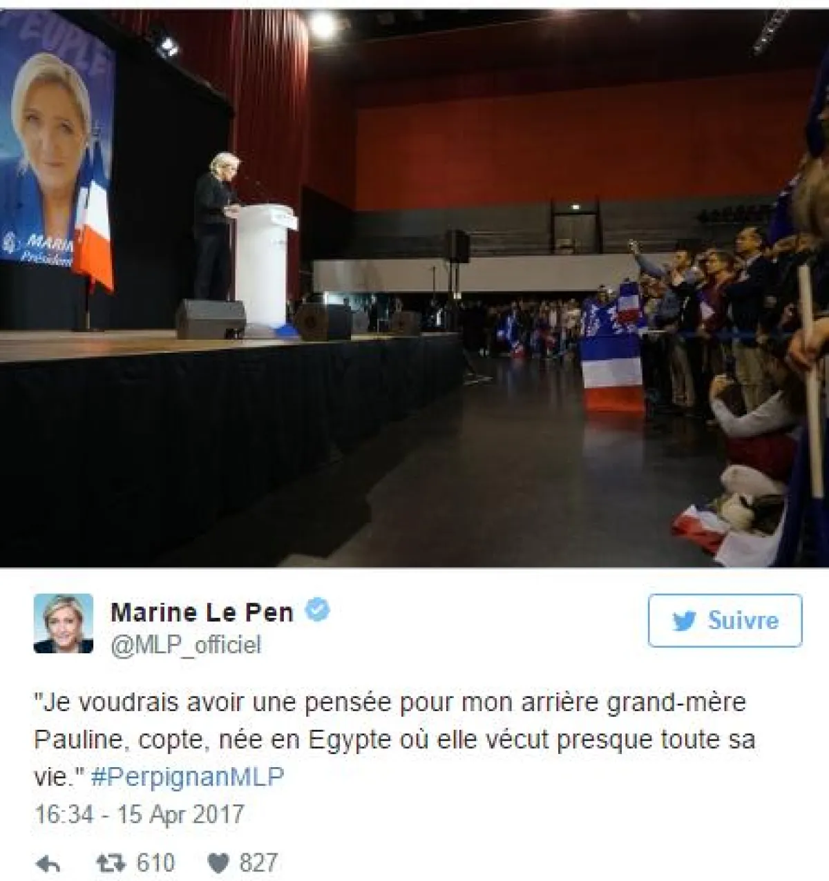 ذكرت مارين لوبان، مرشحة الجبهة الوطنيّة للرئاسة الفرنسيّة، إنّ جدّتها الكبرى، بولين، من أصول عربيّة.