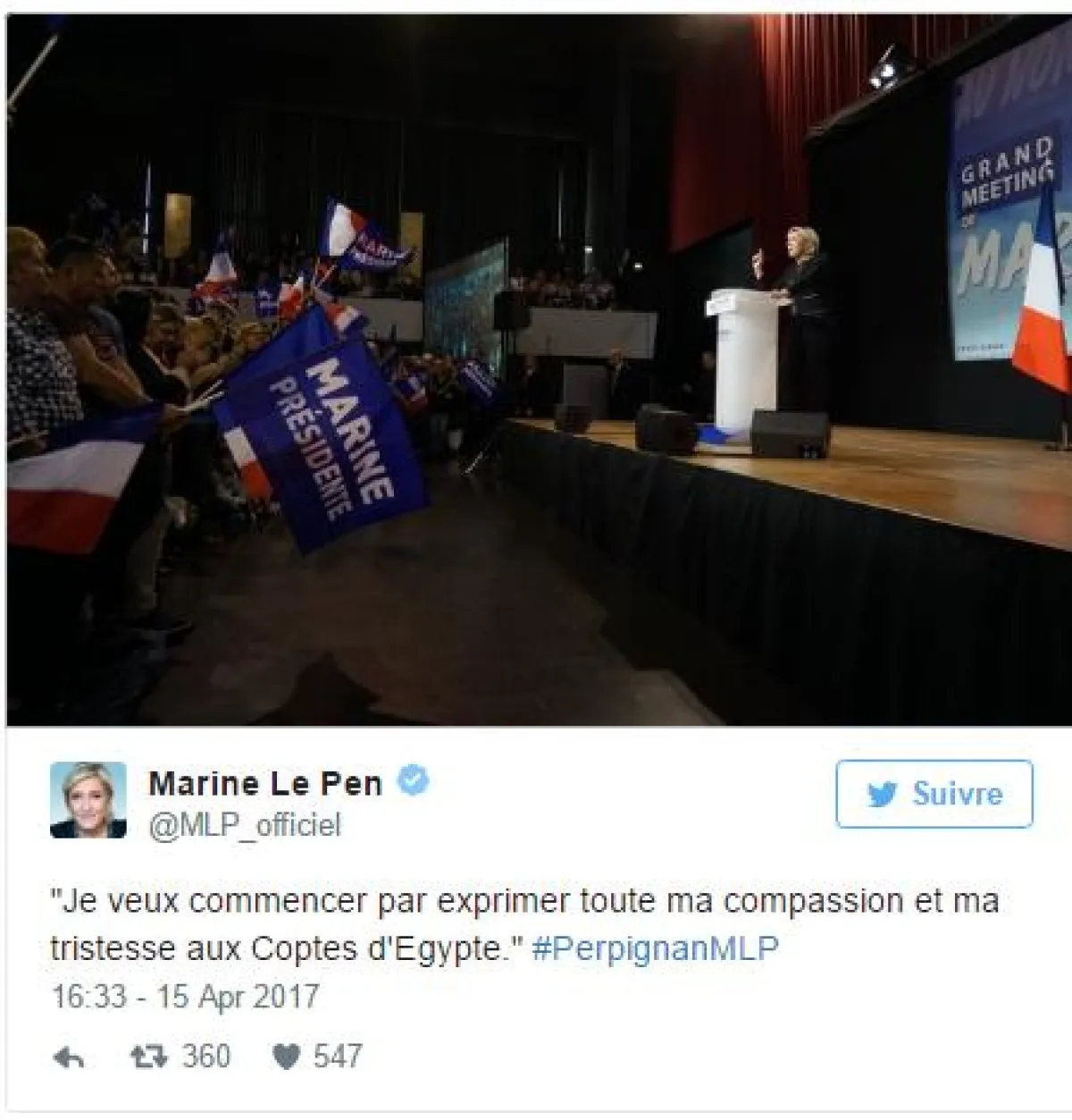 وخلال سلسلة تغريدات على صفحتها الرسميّة في موقع التواصل الاجتماعي " تويتر"، أعربت المرشحة الأوفر حظًّا، عن تعاطفها الكبير وحزنها لأقباط مصر، في إشارة للهجوم الأخير الذي استهدف كنيستين، في طنطا والإسكندريّة.