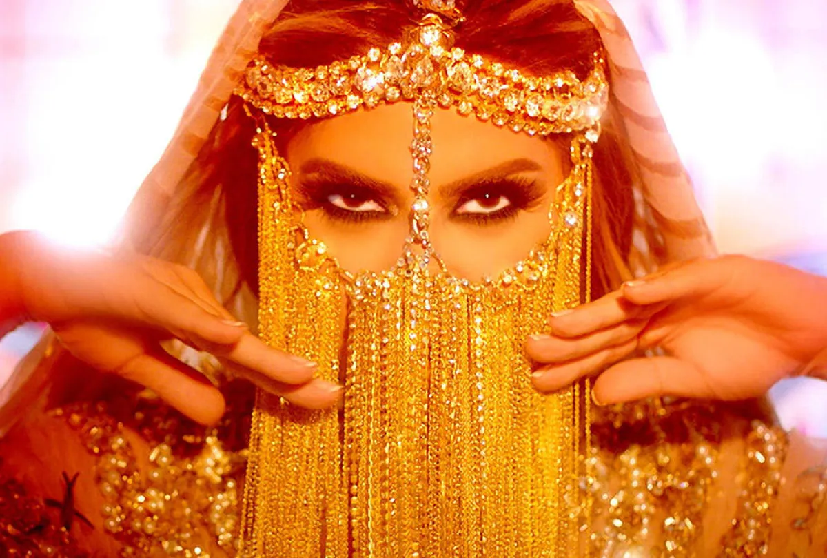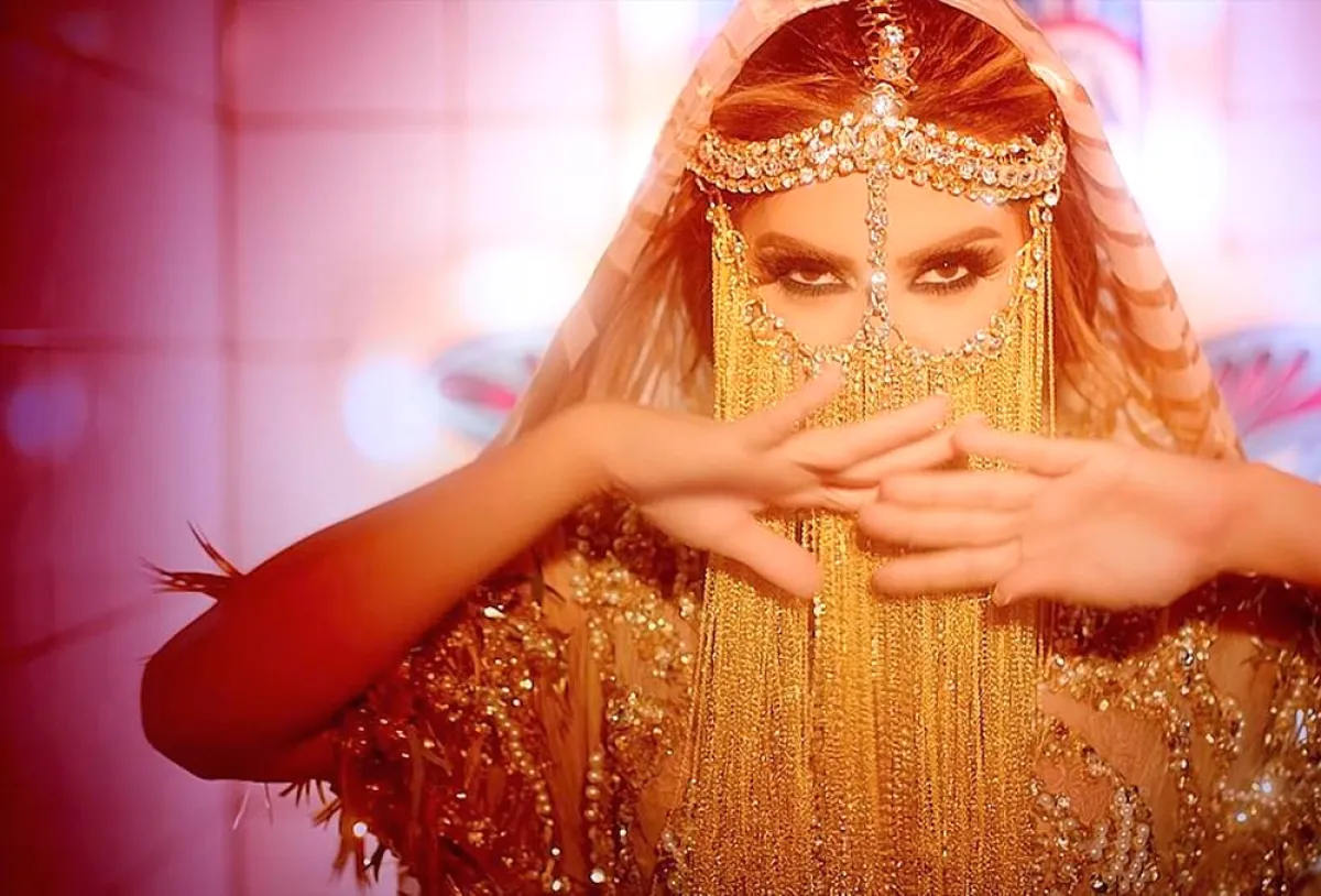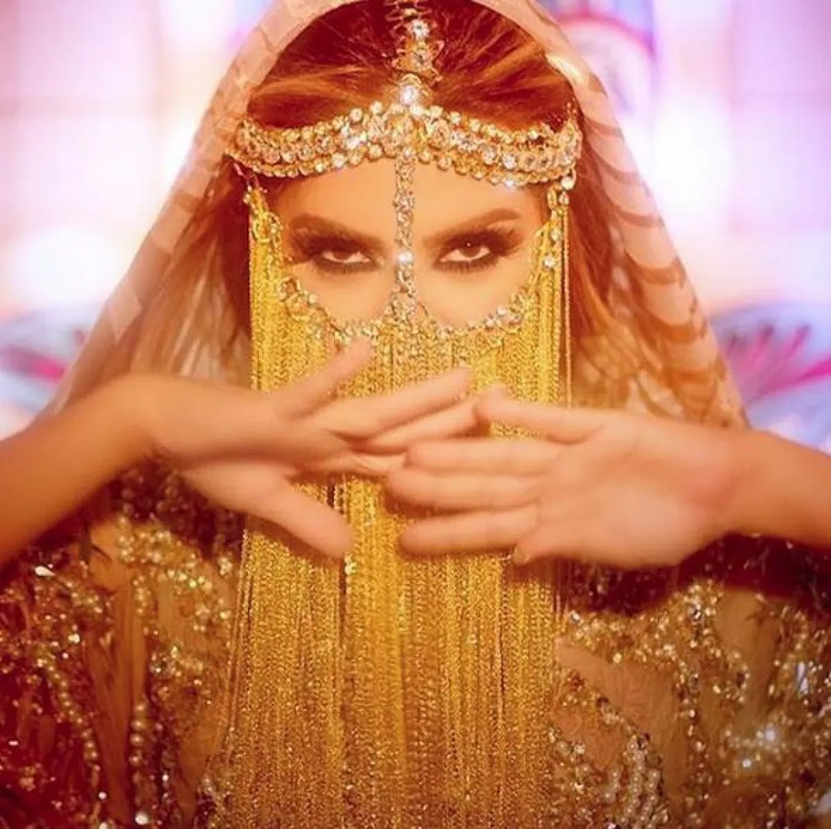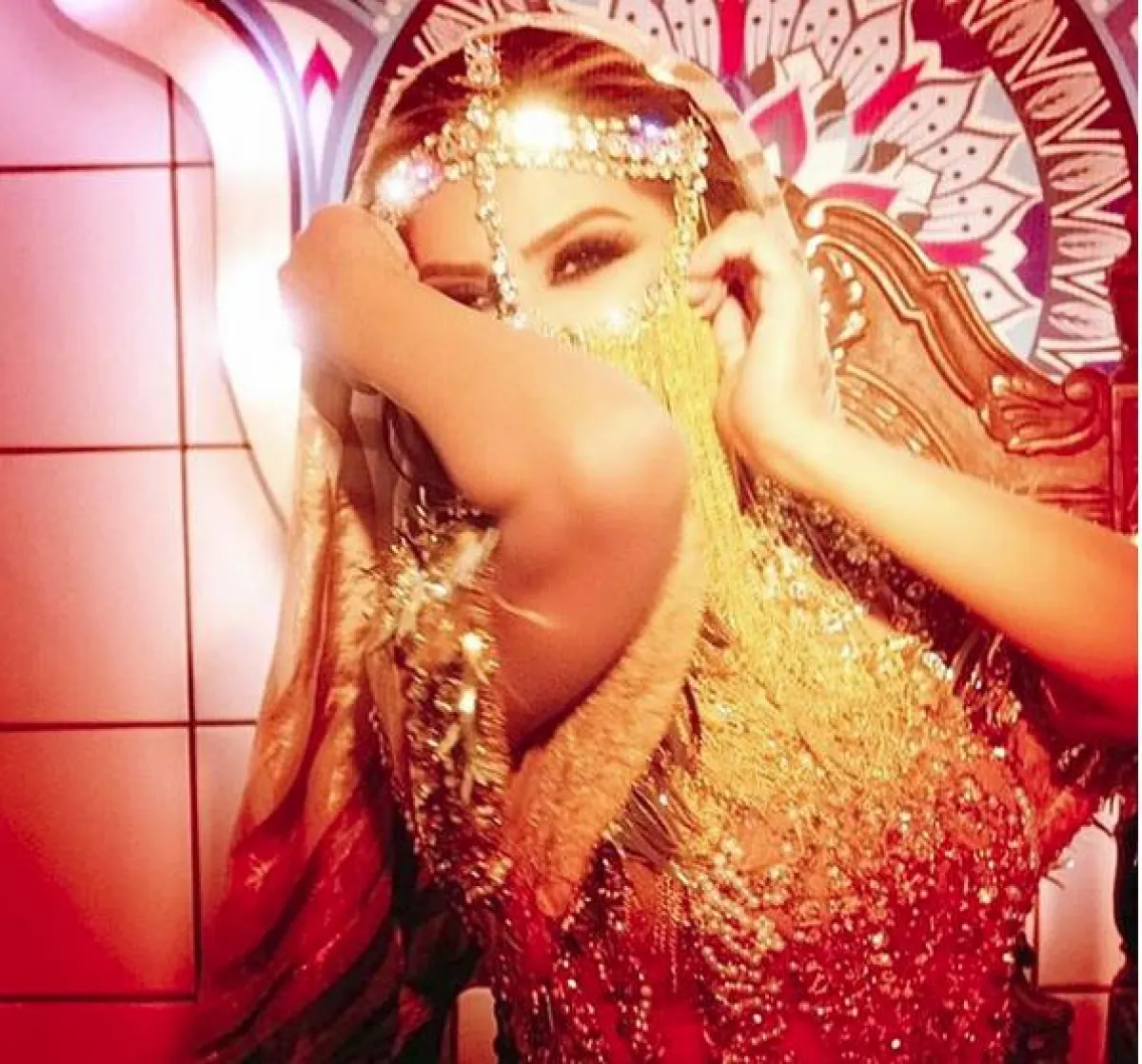 أولاً لا بدّ أن نشرح عن اللوك الغجريّ، حيث سرّحت شعرها نحو الخلف، وطبّقت الاكسسوار الذهبيّ الذي يشكل فرقاً نصفيًّا، ومن ثمّ ينسدل على الوجه بشكل سلاسل معدنيّة ذهبيّة، مع الوشاح الذي يغطي الشعر من الخلف. يتميز هذا الاكسسوار بقدرته على إبراز جمال العينين، ولا سيّما مع المكياج العربيّ الدخانيّ القوي.