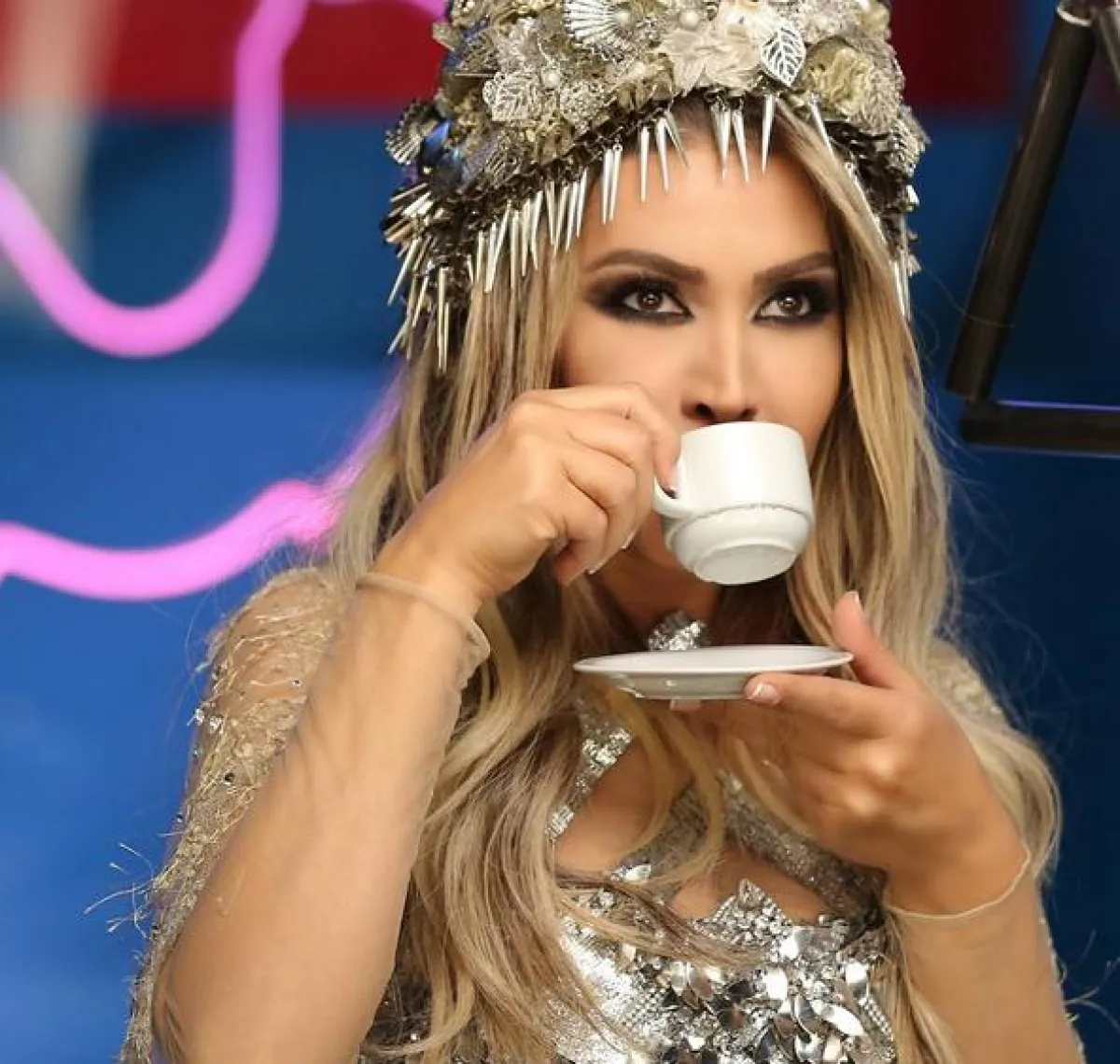 كما استخدمت نوال اكسسواراً مميزاً على شكل تاج حول شعرها، مصنوعٍ من الورود المعدنيّة، وتتدلى منه حبّات فضيّة على شكل دموع. هذا الاكسسوار يناسب المراة العربيّة في السهرات.