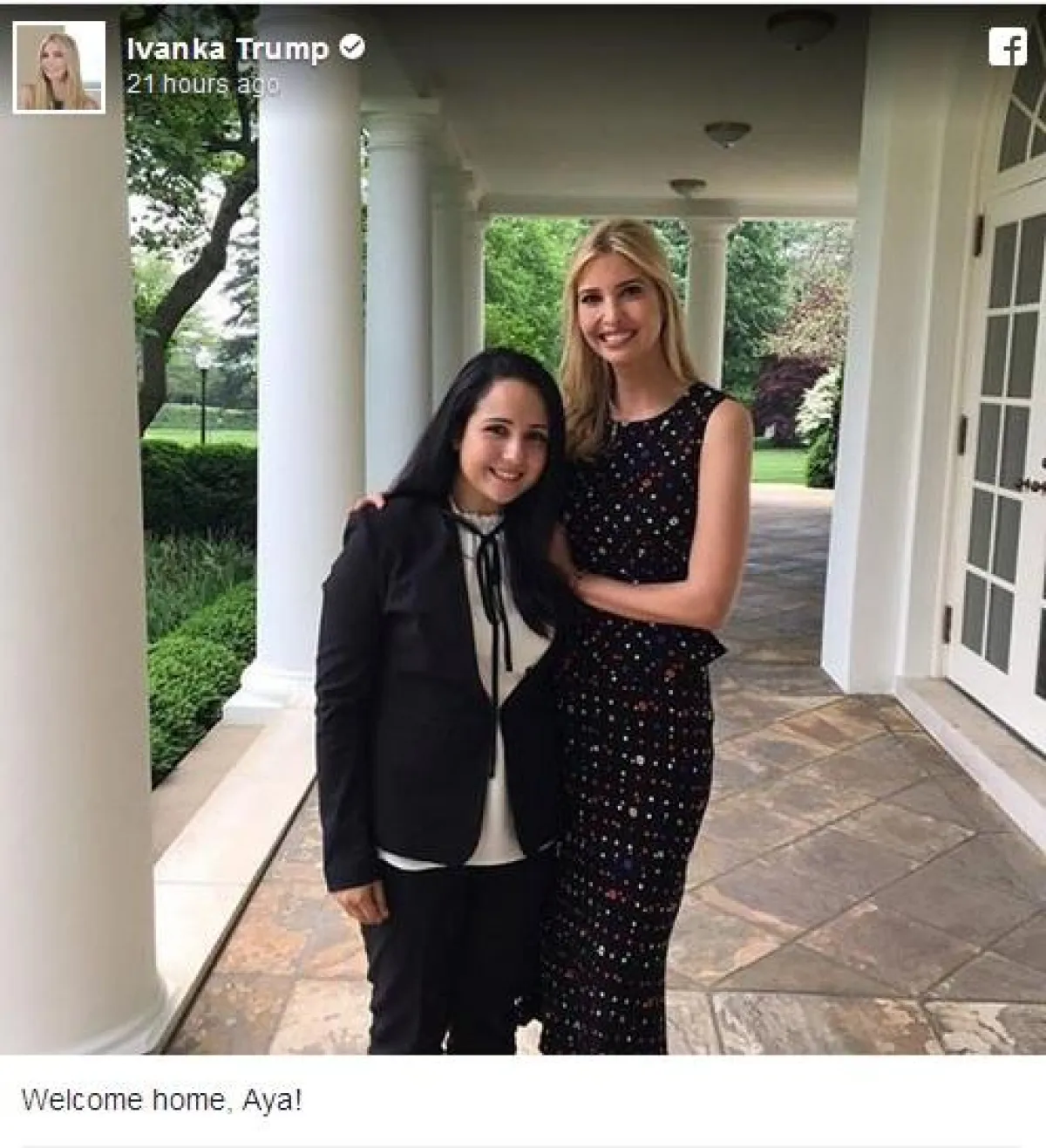 الصورة التي شاركتها إيفانكا عبر "فيس بوك"، حظيت بتفاعل واسع، من قبل الآلاف الذين رحبوا بعودة آية الى الولايات المتحدة الأمريكية.