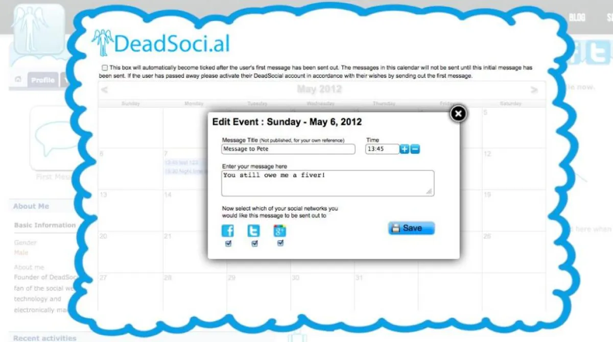 وعبر برنامج “ DeadSocial ”، أصبح بإمكنك أن تُغرّد وأنت ميّت، إذ يدير هذا الموقع حساباتك الإلكترونية بعد الموت.