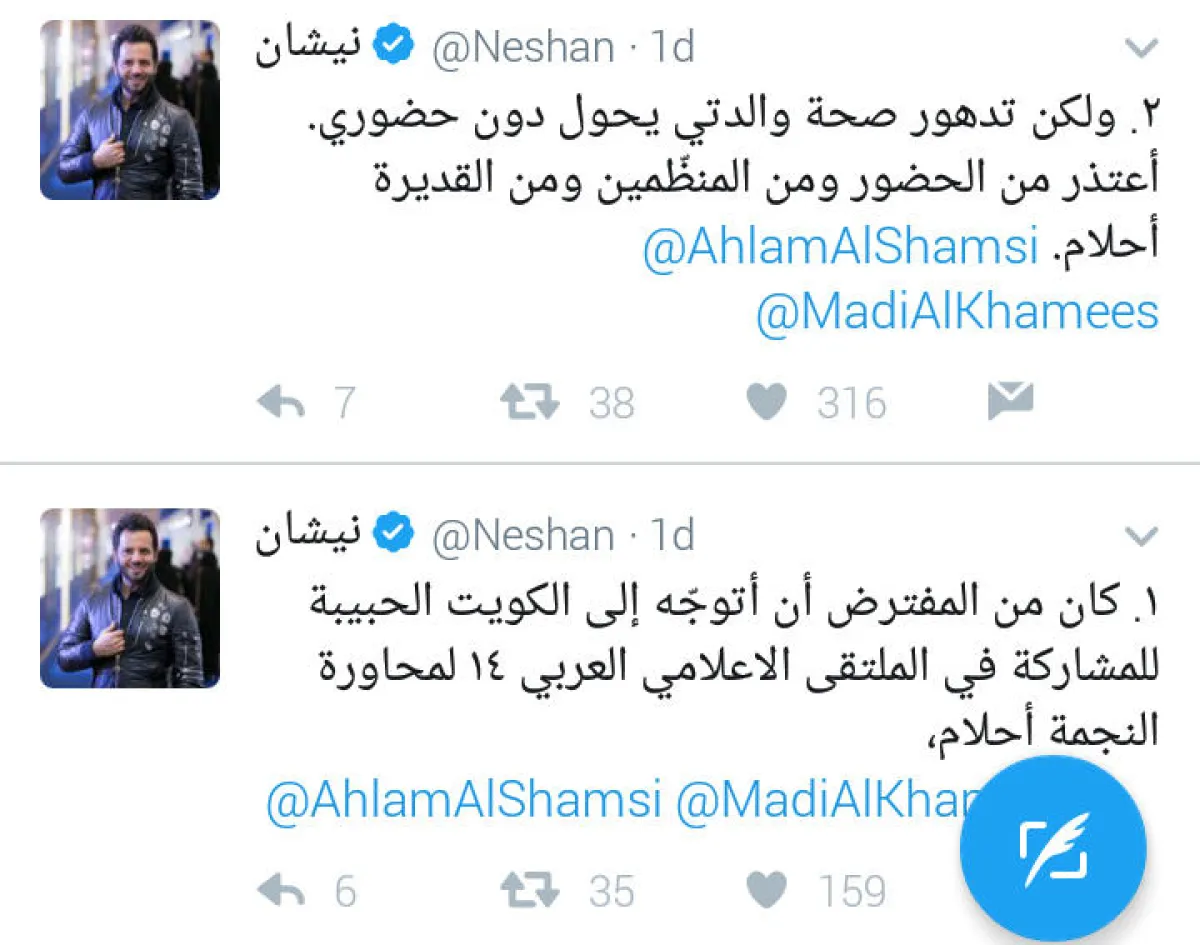 نيشان كتب قبل يوم واحد "كان من المفترض أن أتوجه إلى الكويت الحبيبة للمشاركة في الملتقى الإعلامي الـ 14 لمحاورة النجمة أحلام"، ثم تابع "لكن تدهور صحة والدتي يحول دون حضوري. أعتذر من الحضور ومن المنظمين ومن القديرة أحلام".