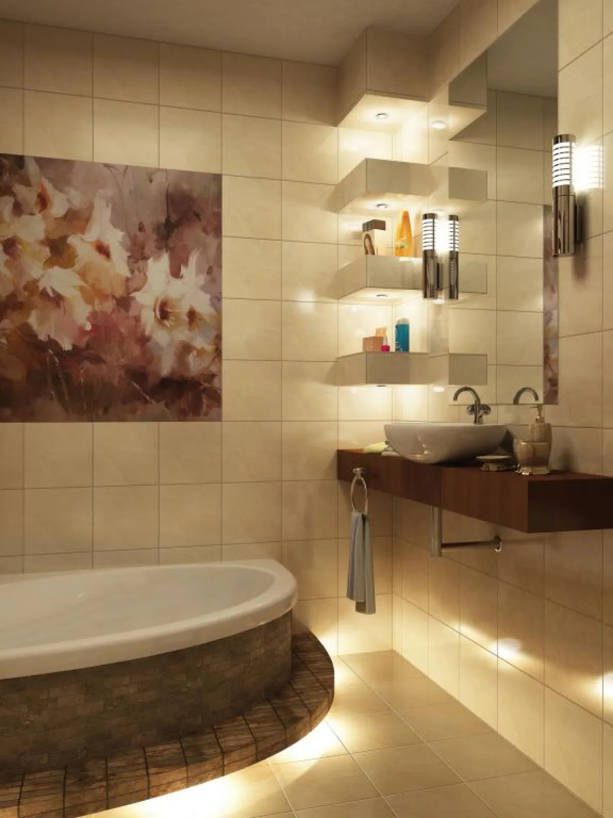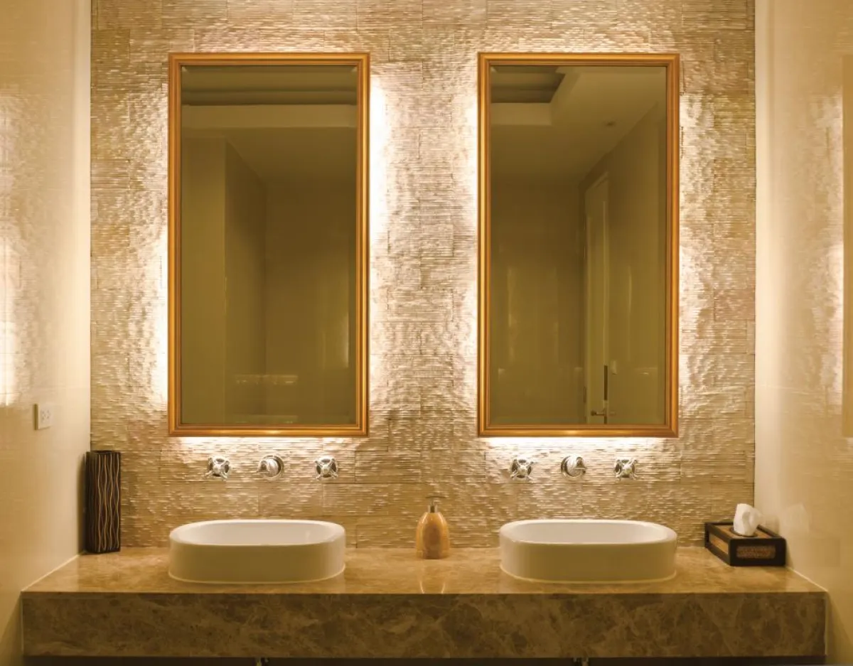 4. الحمّام: تكون الإنارة المجاورة للمرآة عالية، بسبب طبيعة الاستخدام، بحيث يتكرّر النظر إلى الوجه، مع تجنّب الـ"سبوت لايت" فوق الرأس، تلافيًا لتكوّن ظلال عالية. ويُمكن الاستعاضة عن هذه الأخيرة بوضع إنارة أماميّة إمّا فوق المرآة، أو بجانبها، أو خلفها.