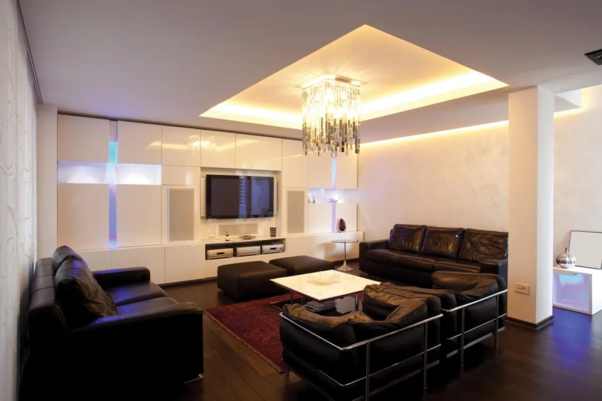 1. الصالون: يحتاج الصالون الرسمي إلى كمّ معتدل وهادئ من الإنارة، فيما ذلك غير الرسمي يتطلّبها عالية. وتشمل إنارة الصالون: الإنارة العامّة الرئيسة التي تأتي مباشرةً من أجهزة مُثبتة في السقف، أو غير مباشرة ومصدرها أجهزة مخفية في السقف أو الجدران، أو تلك التي تدمج بين النوعين. وأيضًا، الإنارة العامّة الثانوية التي تتمّ تلك الرئيسة، وتشمل: "الأباجورة" التي تتموضع على الطاولة أو الأرضيّة، أو تلك المؤمنة عبر أجهزة مثبتة في السقف أو الجدار. وبصورة عامّة، تمنح الإنارة الرئيسة كميًّا كافيًا من النور لكامل الصالون، فيما تلك الثانوية تتصف بالهدوء، وقد تُستخدم بمفردها أو بصحبة الإنارة الرئيسة.