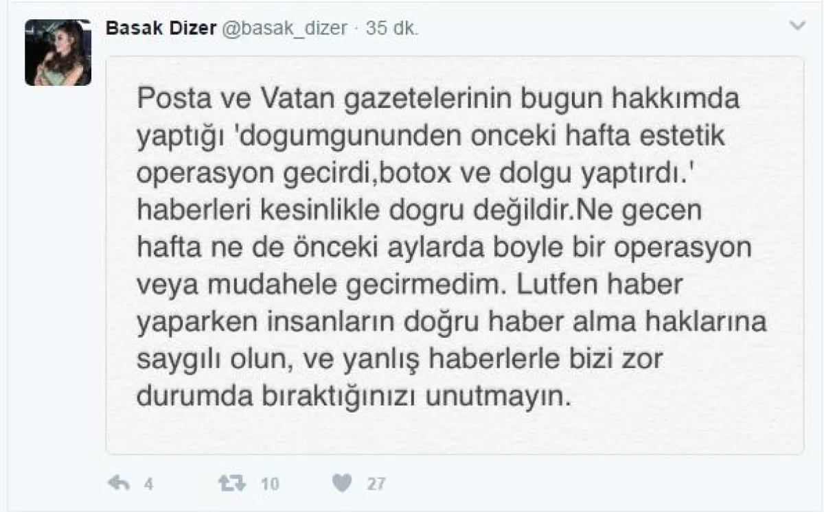 أكدت عدة صحف تركية خاصة "بوستا" و"الوطن" بأن خبيرة الموضة التركية الشهيرة باشاك ديزير زوجة الممثل التركي الوسيم كيفانش تاتليتوغ الشهير بجسور بطل "الشجاع والجميلة"، سافرت إلى لندن بهدف إجراء عمليات تجميل وحقن بوتوكس لإخفاء عمرها الحقيقي وأنها أكبر من زوجها بسبع سنوات تقريباً خاصةً حول عينيها، وبعض جوانب وجهها ووجنتيها بمناسبة عيد ميلادها الأربعين . ولكن هذه الأخبار أغضبت باشاك ديزير جداً، فخرجت عن صمتها، ووصفت الخبر الذي نشر قبل أسبوع في صحيفتي " الوطن" و"بوستا" بالكاذب وذكرت في حسابها الشخصي بموقع التواصل الإجتماعي "تويتر" أن ما نشر حول هذا الأمر غير صحيح.