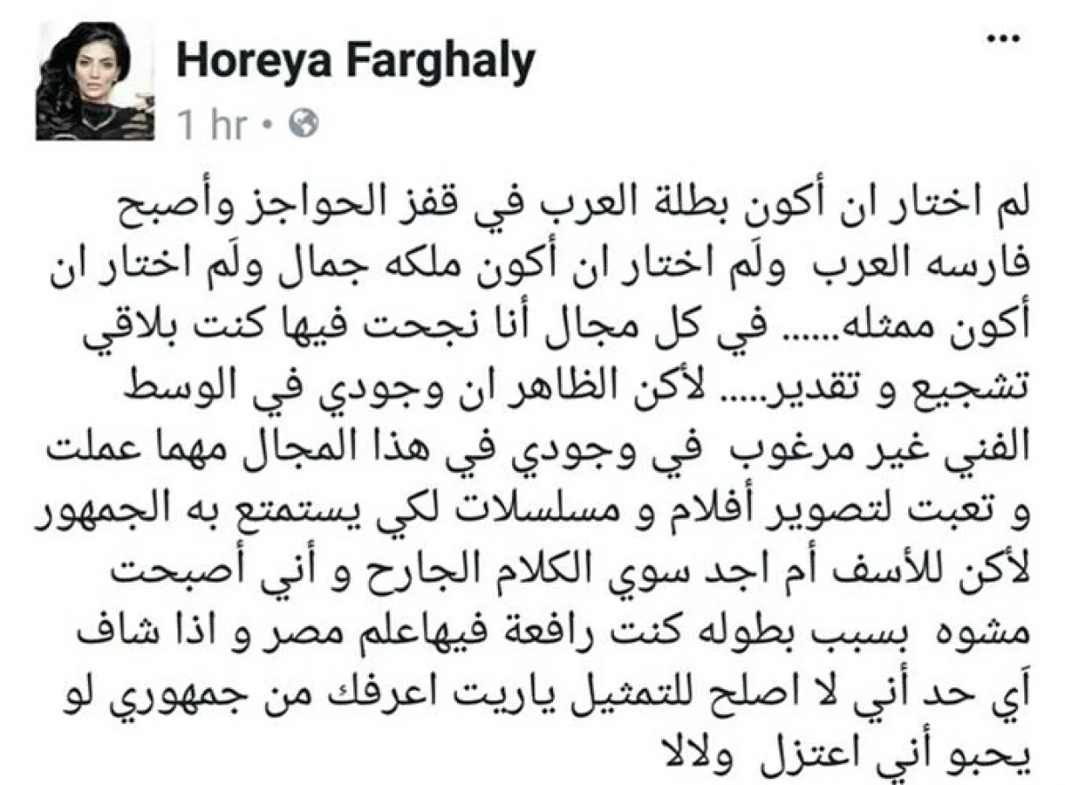 لم تجد الفنانة حوريّة فرغلي حلًّا لوقف سيل الانتقادات الموجّهة لمظهرها، والتشكيك في لقبها كملكة جمال مصر، بعد حلقتها المثيرة للجدل مع الإعلاميّ عمرو أديب، إلّا نشر رسالة مؤثّرة جدًّا لجمهورها وأصدقائها، عبر حسابها الشخصيّ بموقع الفيس بوك، ذيّلتها بطلب تصويت الجمهور على قرارها اعتزال التمثيل، وبعد 12 ساعة فقط، حذفت حوريّة الرسالة بالكامل، ووضعت بدلًا منها، مقتطفات من الأقوال المؤثّرة والأدعية، حول الانتقام الإلهي ممّن يجرح الناس ويكسر القلوب!!