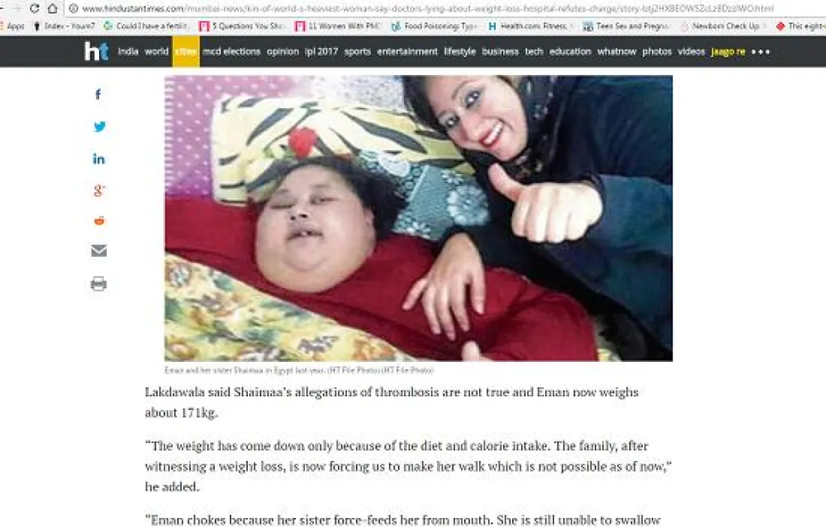 قال الطبيب الهندي «موفازال لاكدوالا»، ردًا على شقيقة إيمان عبدالعاطي: إن ادعاءات شيماء أخت أسمن امرأة في العالم، غير صحيحة، خاصة المتعلقة بتجلط الدم، مضيفًا، أن إيمان فقدت الوزن بالفعل وحاليًا تزن 171 كيلو جرامًا.