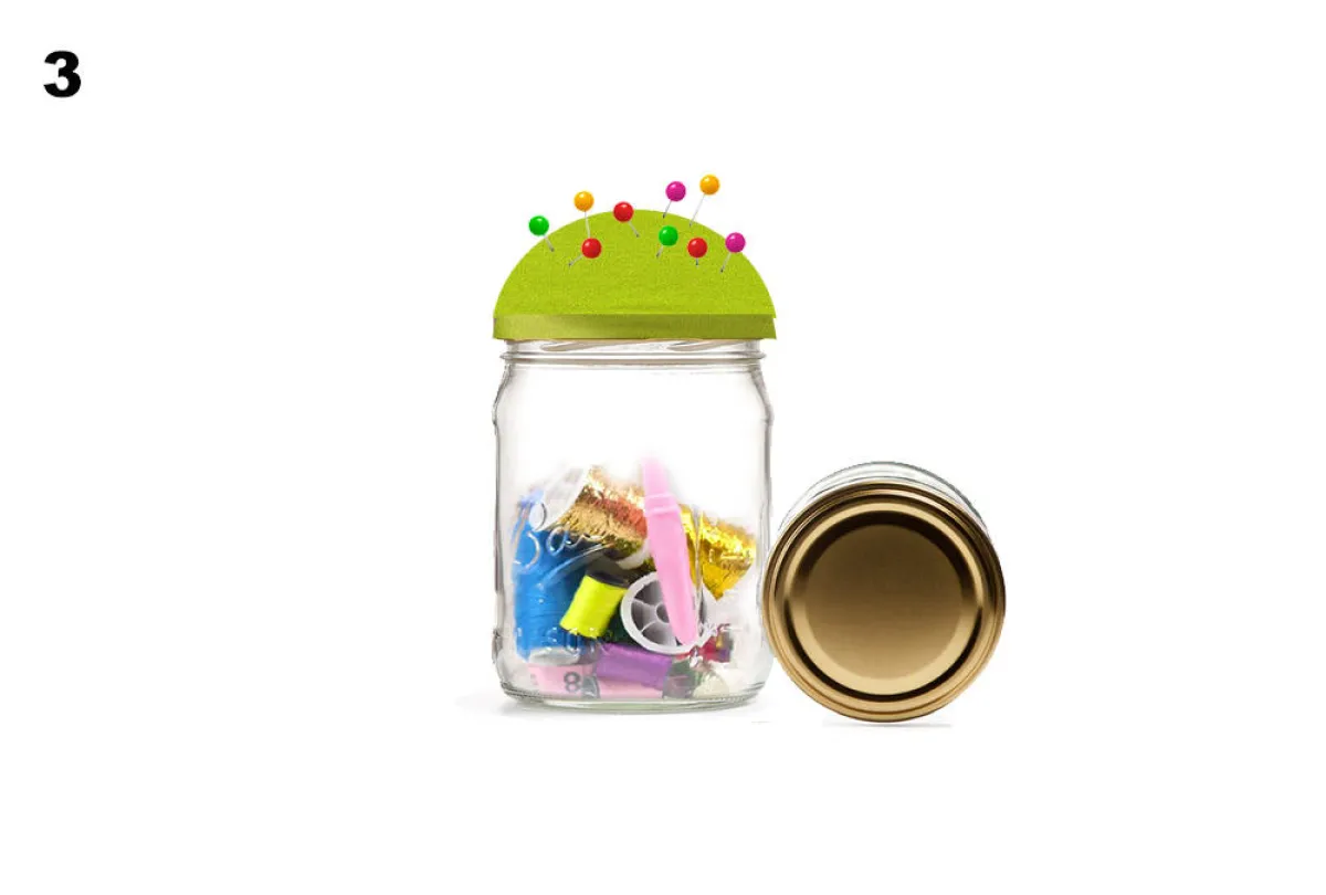 3. توضع أدوات الخياطة داخل البرطمان، ويُحكم إغلاقه. وتشكّ الدبابيس الملونة في الغطاء المحشو بالقطن.
