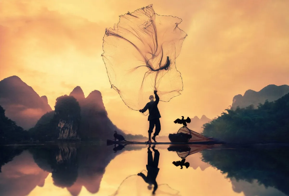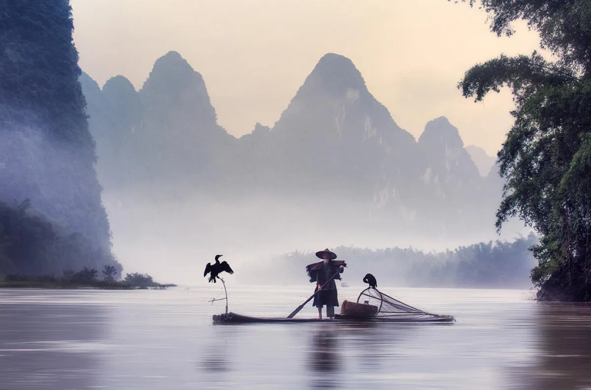في إحدى الجزر الصينيَّة، تقف سلسلة جبال شاهقة وراء نهر ساكن؛ ليفرد ضوء الفجر خصلاته على متون تلك الجبال، ويتوسط المشهد قارب هادئ على ظهره صيادٌ وقنديلٌ، وطائرٌ فارد جناحيه بحماس يوازي انطلاقة شباك الصيد.