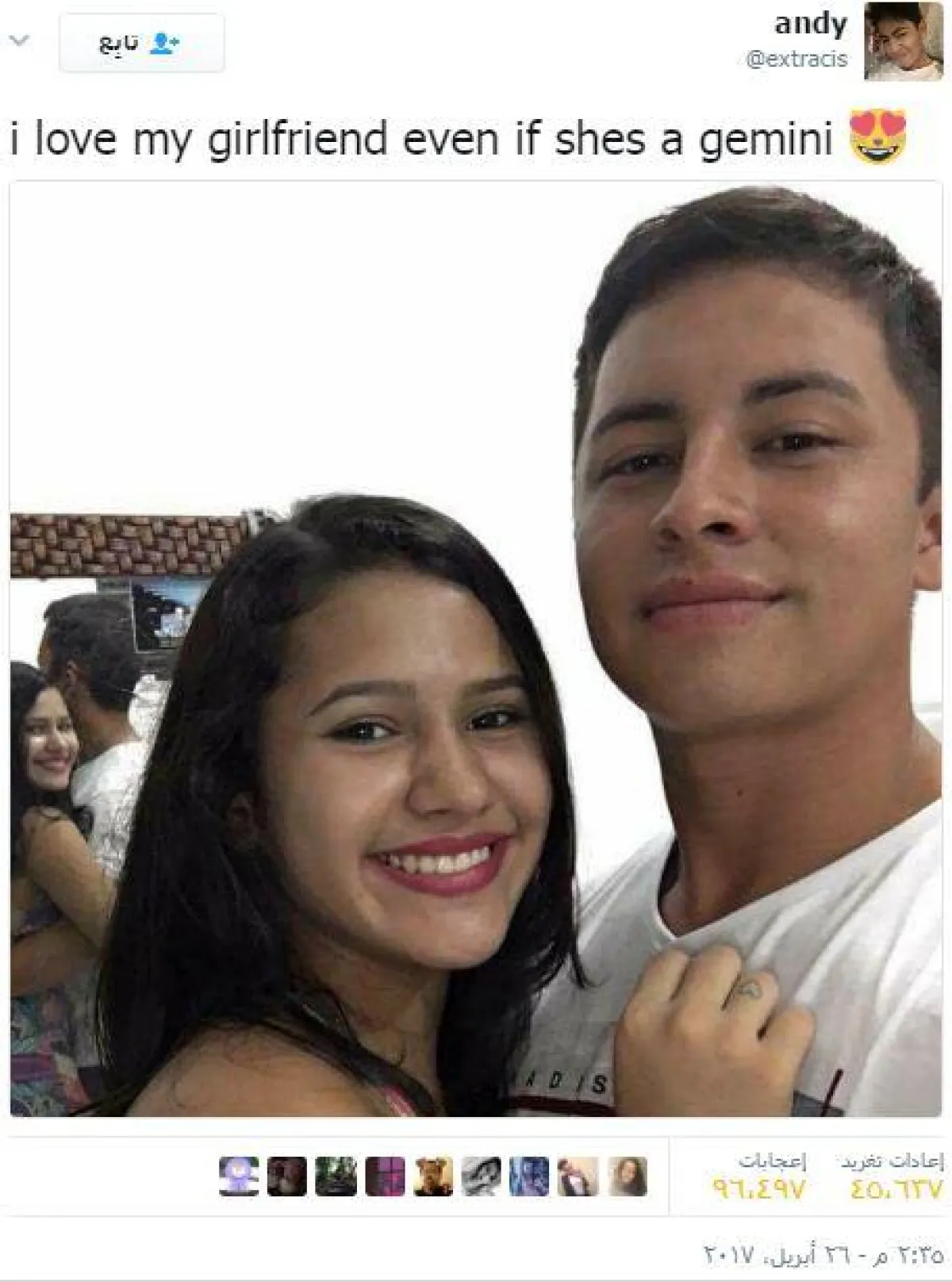 وقد لاقت الصورة الغريبة رواجاً كبيراً على مواقع التواصل الاجتماعي، بعد أن نشرها الشاب على موقع "تويتر" وجاء تعليق صاحب الصورة عليها أنه يحبّ صديقته حتى ولو كانت جوزاء، أي إذا كانت بوجهين، وفسّر البعض ذلك بأنه ربما يكون للفتاة شقيقة توأم وأن الجوزاء إشارة إلى ذلك .