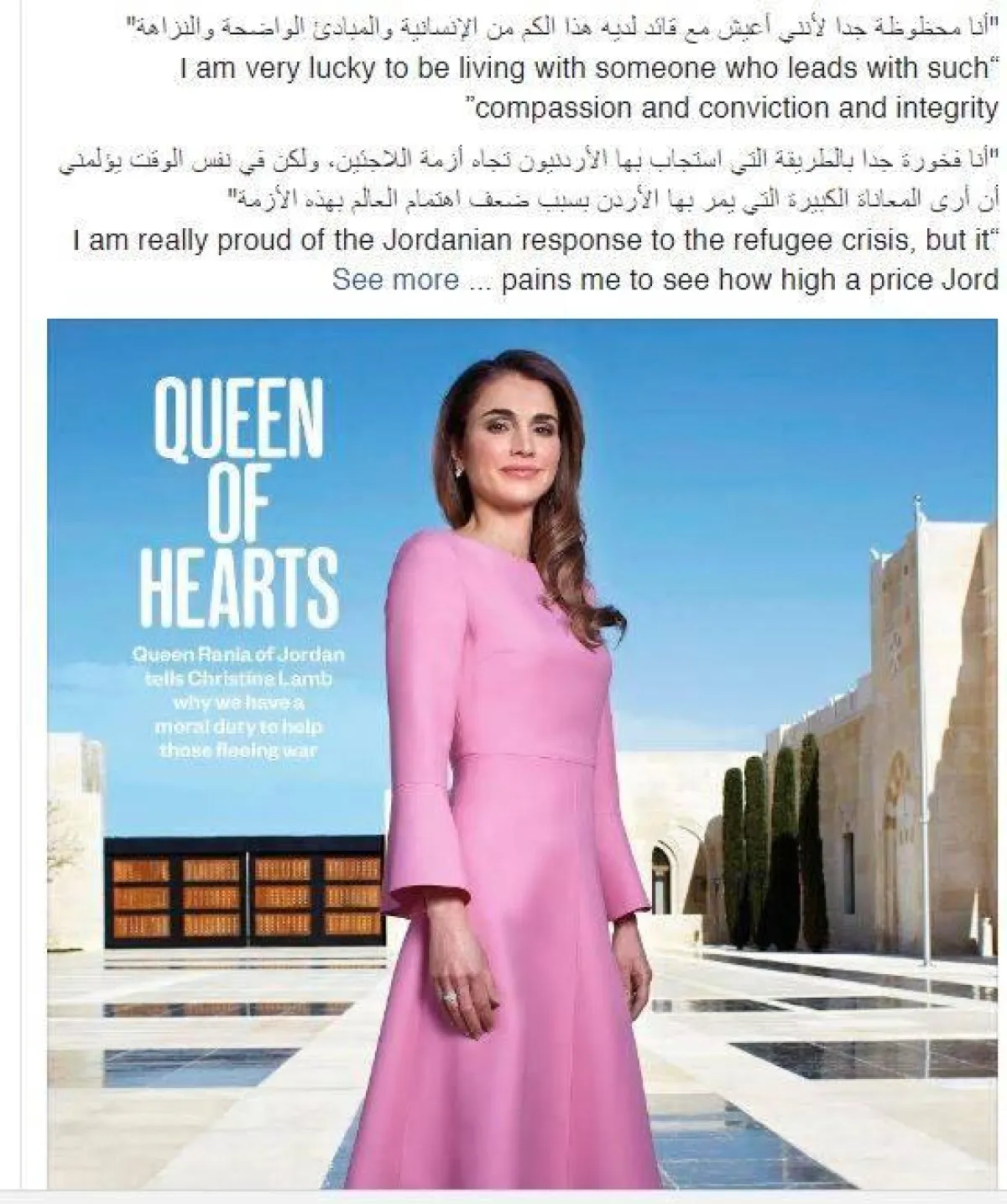 ونشرت الملكة رانيا مقتطفات من هذا الحوار على صفحتها الرسمية عبر موقع التواصل الإجتماعي "فيسبوك"، مرفقة بصورة التقطتها المجلة للملكة، مكتوب عليها عناوان الحوار نفسه "ملكة القلوب".