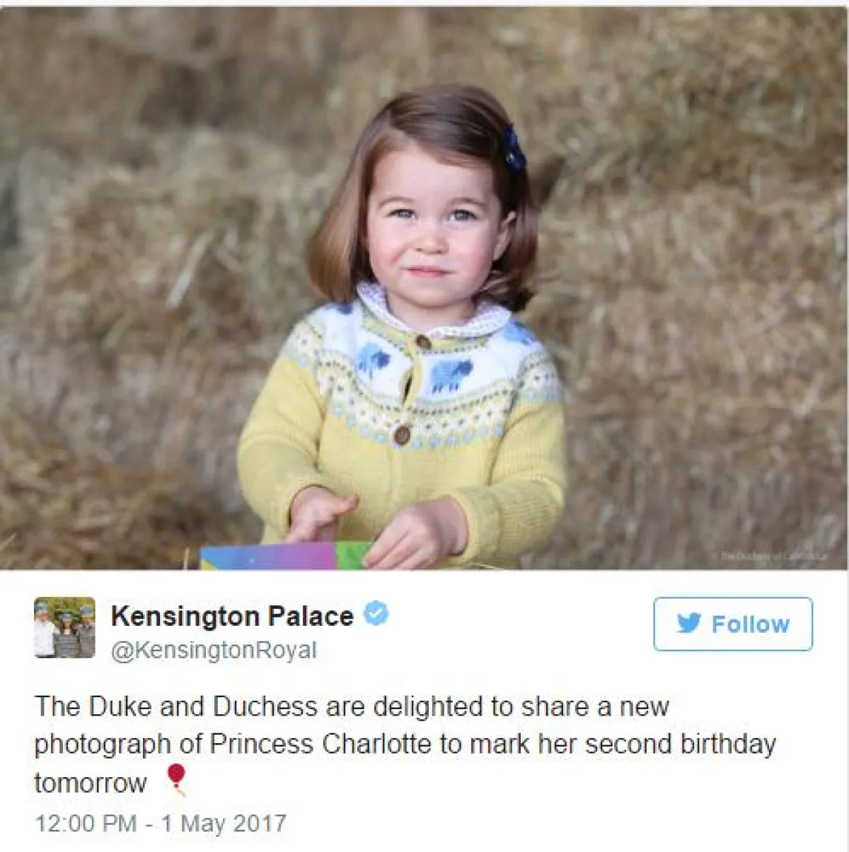 تحتفل الأميرة شارلوت Charlotte، ابنة دوق ودوقة كامبريدج وليم William وكايت ميدلتون Kate Middleton بذكرى ميلادها الثانية يوم غد الثلاثاء.
