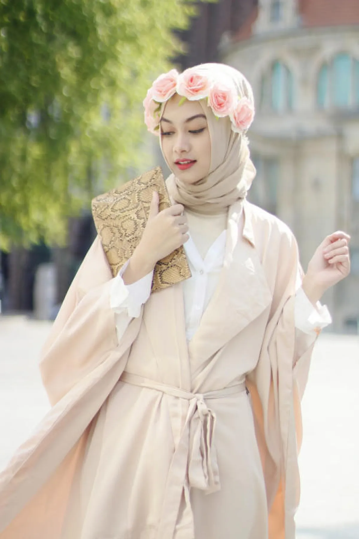 لا تختاري إطلالة كاجوال، بل اختاري ملابس راقية مع لمسة أنوثة، لتليق لفّة الطرحة المزيّنة بالورود .