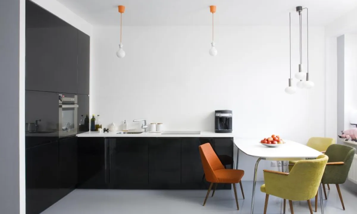 للأثاث، يُفضّل استخدام المواد العمليّة، كالزجاج، للطاولة سواء مستطيلة الشكل أو المربعة أو البيضويّة أو الدائريّة، وذلك حسب مساحة الغرفة، وللدواليب، بعيدًا عن الخزائن ذات الزوايا الحادّة. ويُستحسن تطعيم الزجاج بالخشب اللمّاع، باللون الأبيض أو الأسود أو آخر. وفي الطراز الـ"مودرن"، يولي المصمّمون عنايةً إلى أدوات المائدة من صحون وملاعق وشوك... وكلّها تُنتقى ذات أشكال جذّابة.