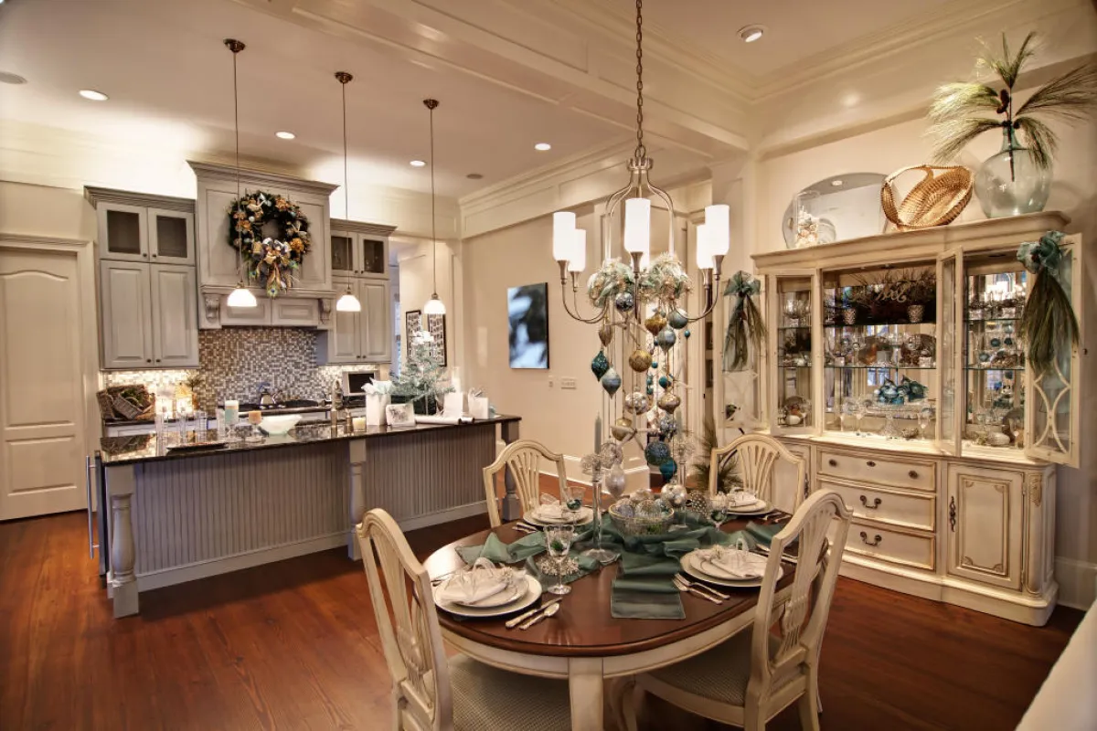 | في النمط الكلاسيكي: تتبع "ديكورات" غرفة طعام الضيوف تلك المتوفّرة في الصالون، لاتصال مساحتيهما. وفي هذا الإطار، يفصل باب أو حاجز بين الحيّزين، أو يكونان متصلين. وإذ معلوم أن الطراز الكلاسيكي يتصف بالفخامة، ويتقدّمه الخشب المنقوش والمطعّم بالذهب والفضة، هو يحتاج إلى مساحة كبيرة لتوظيفه بطريقة ناجحة. وفي هذا الإطار، ستكون الطاولة ثقيلة، وفي قوائمها تصميم مميّز. أمّا للكراسي، فيمكن استخدام المخامل أو الأقمشة الفخمة الأخرى، مع حضور الإكسسوارات والثريا الكريستال.