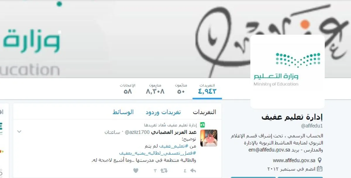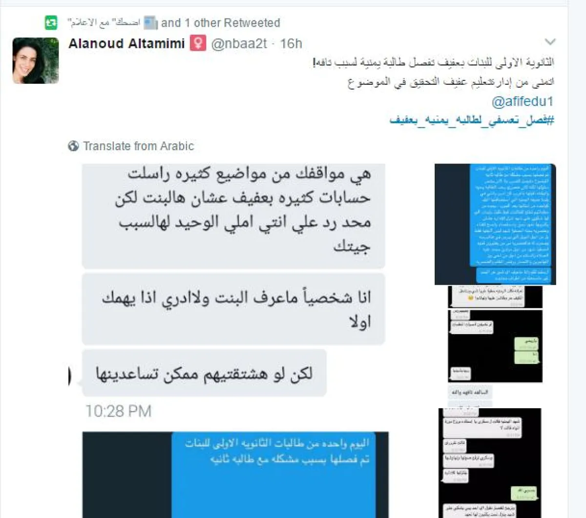 افتتح المغرِّدون على موقع التَّواصل الاجتماعي "تويتر" وسماً باسم "#فصل_تعسفي_لطالبه_يمنيه_بعفيف"، والذي قالوا فيه: إنَّ طالبة ثانويَّة في عفيف تعرَّضت للفصل لسبب تافه، مهاجمين فيه إدارة المدرسة، ومطالبين إدارة التَّعليم في عفيف بمعاقبة من تسبب بهذا الفصل.