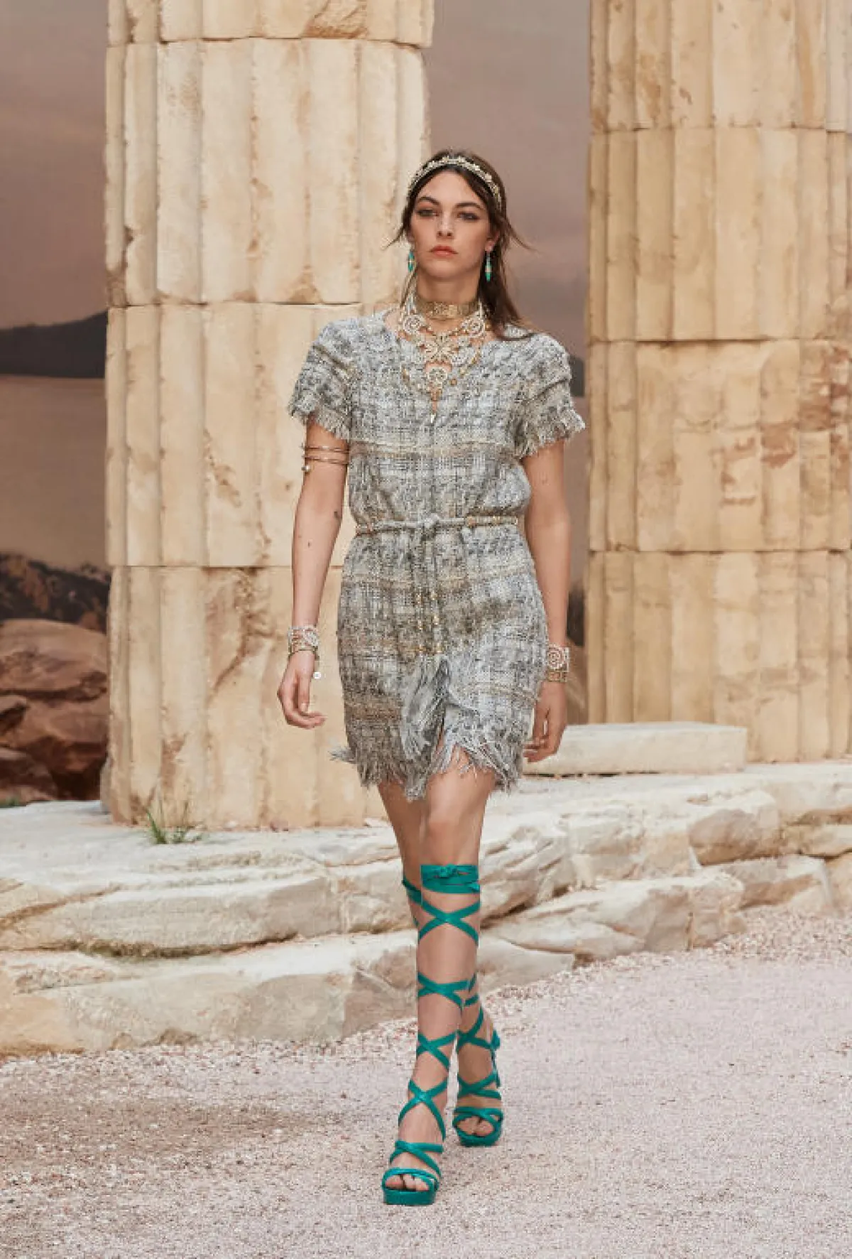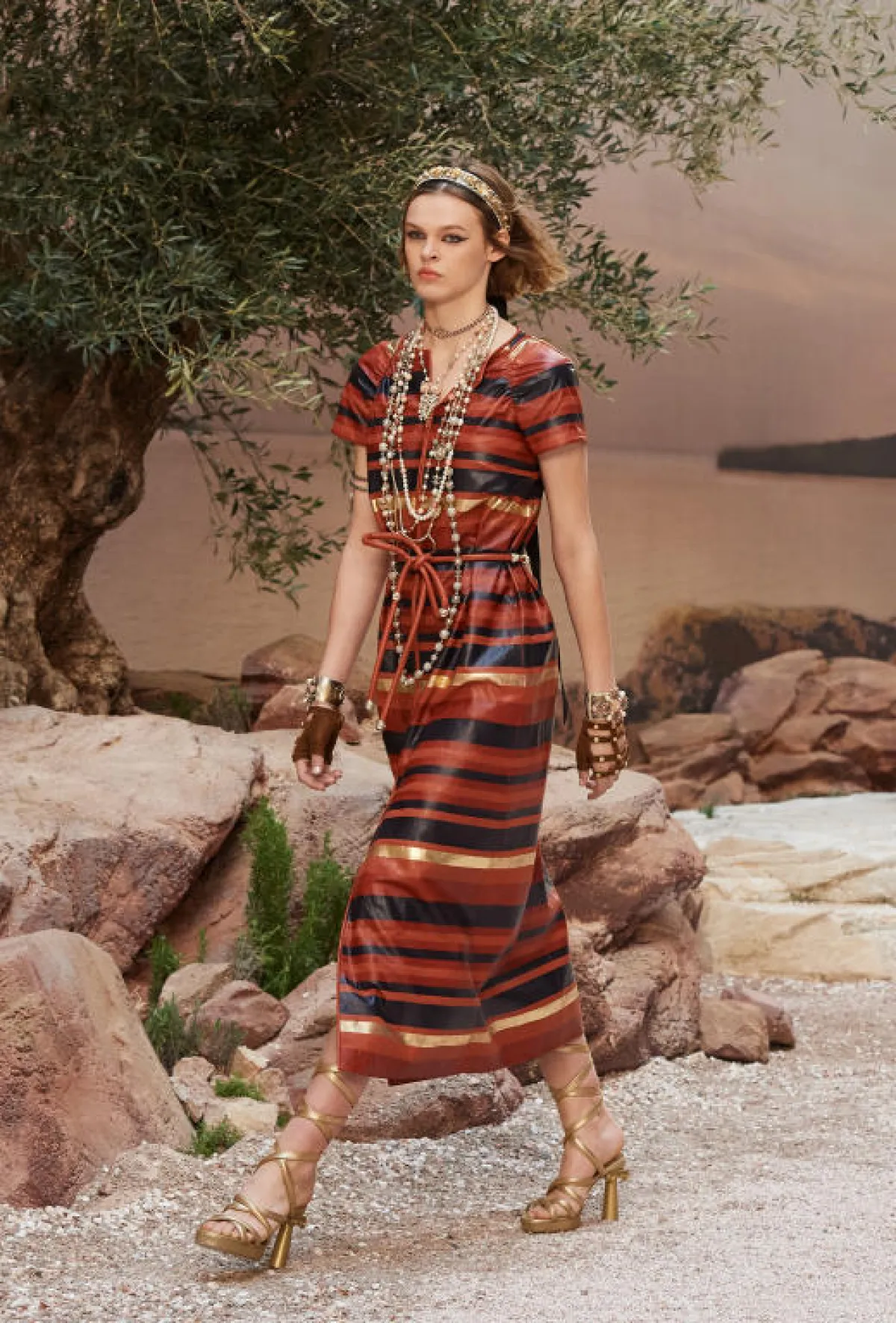 هذا العرض بكلّ ما فيه، يعود بنا إلى الموضة القديمة، فقد استخدم كارل قماش الـ"تويد"، الذي ُعرفت به شانيل على مرّ السنين، وحفل العرض بالفساتين الريفيّة بطابع يوناني، مع الأحزمة والأربطة بألوان الطبيعة الخضراء، وتدرجات البيج والبُنّي، والنقوش البريّة، والكشكشات الصغيرة، ويبدو اللون الذهبيّ المعدنيّ اللامع سائدًا طوال العرض، إضافة إلى الاكسسوارات والسلاسل العشوائيّة، وعقود الرقبة بروح البوهيميّة، يظهر كيف استبدل كارل "إكليل الغار- Laurel wreath" اليوناني الشهير، بتيجان الرأس الحديثة المذهّبة والشرائط، كما نرى القفّازات الجلديّة "المخرّقة" بأشكال خطوط متداخلة، والأحذية الصندال المستوحاة من أحذية المصارعة اليونانيّة Gladiator Sandals والتي أثبتت إحكام قبضتها على الساق منذ الأزل.