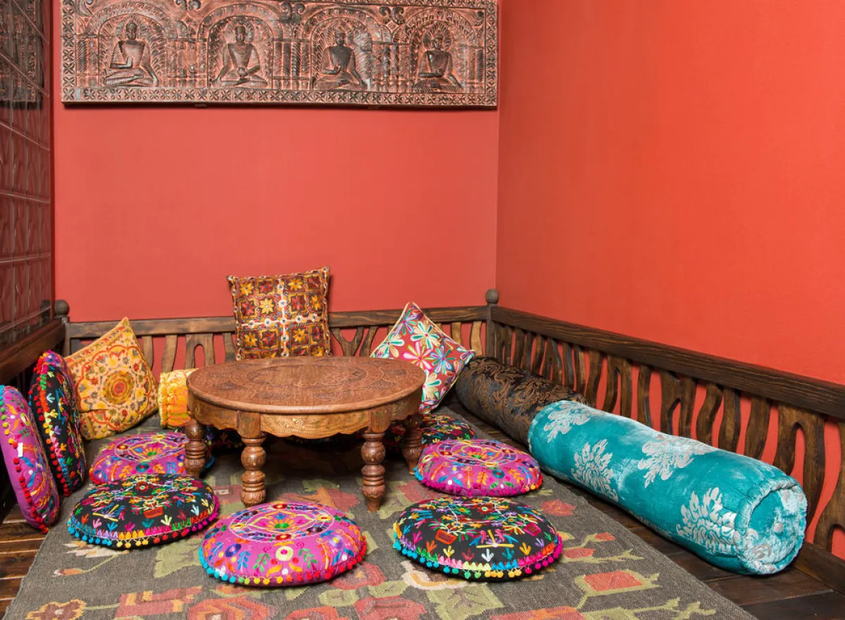 2. في المجلس: تُضاف الوسائد المُلوَّنة والمنقوشة برموز رمضانيَّة، كالهلال والمسجد، على الأرائك. ويُخصَّص ركنٌ للضيافة في إحدى الزوايا الفارغة، ويُزيَّن بزينة رمضان والشموع. وتُستحدث جلسة لشرب القهوة بعد الإفطار في زاوية أخرى، وتؤثَّث بمجموعة من الـ"بوف" المُلوَّنة والمُطرَّزة بنقوش شرقيَّة، على أن تتوسَّطها طاولة صغيرة ترفع على سطحها الإكسسوارات.