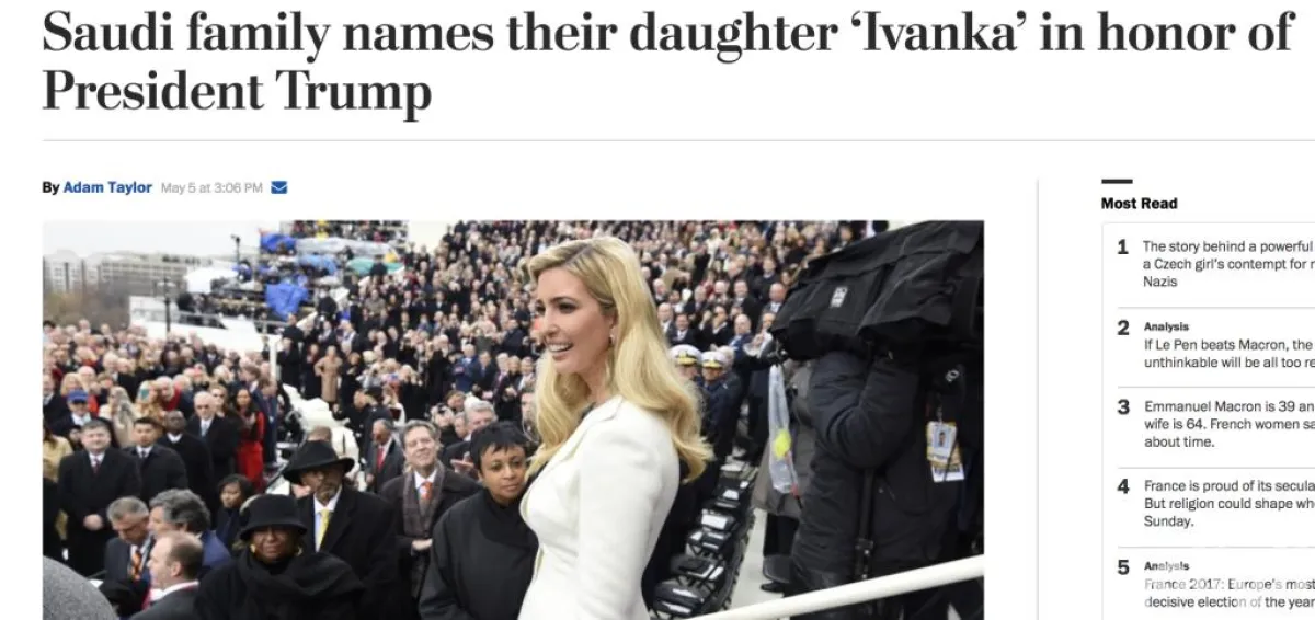 تصدر خبر تسمية مولودة سعودية باسم ابنة الرئيس الأمريكي دونالد ترامب "إيفانكا" مؤخراً وسائل إعلام أمريكية عدة، من بينها صحيفة الواشنطن بوست الشهيرة، حيث أكدت وسائل الإعلام أن اهتمام مواطن سعودي بتسمية ابنته باسم ابنة الرئيس الأمريكي كان بسبب تحدٍّ لوالد الطفلة سالم العنزي مع أصدقائه لتسميتها بهذا الاسم الغريب.