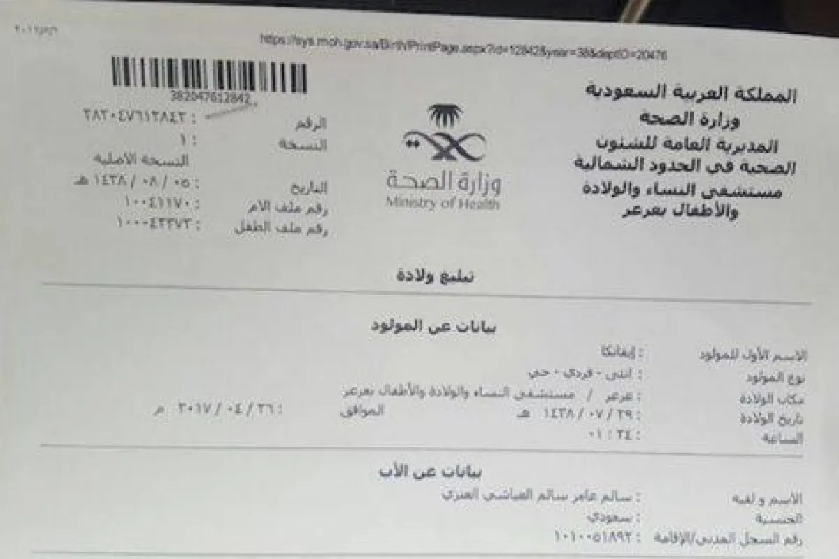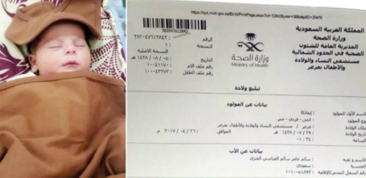 وقال العنزي إنه ذهب ببيان الولادة الصادر عن مستشفى النساء والولادة بعرعر، الذي تداوله رواد مواقع التواصل الاجتماعي تداولاً كبيرًا، أمس الجمعة، إلى موظف الأحوال المدنية لتسجيل اسم ابنته، لكن الموظف أخبره أن الاسم "ممنوع".