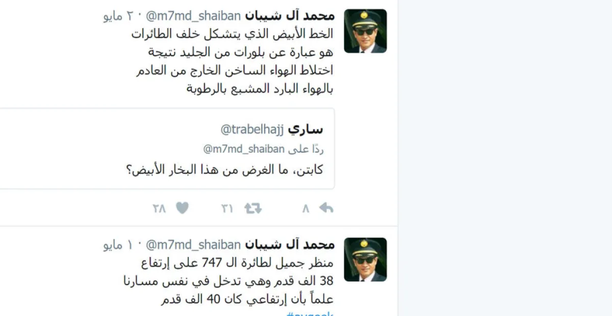 أثارت تغريدة لأحد الطَّيارين المنتسبين لشركة الخطوط الجويَّة السعوديَّة تفاعلاً كبيراً من قبل نشطاء "تويتر"، حيث غرَّد الكابتن محمد آل شيبان على حسابه في موقع "تويتر" بمقطع فيديو، صوَّره أثناء تحليقه في الجو لطائرة أخرى، قائلاً: "منظر جميل لطائرة الـ747 على ارتفاع 38 ألف قدم، وهي تدخل في نفس مسارنا، علماً بأنَّ ارتفاعي كان 40 ألف قدم".