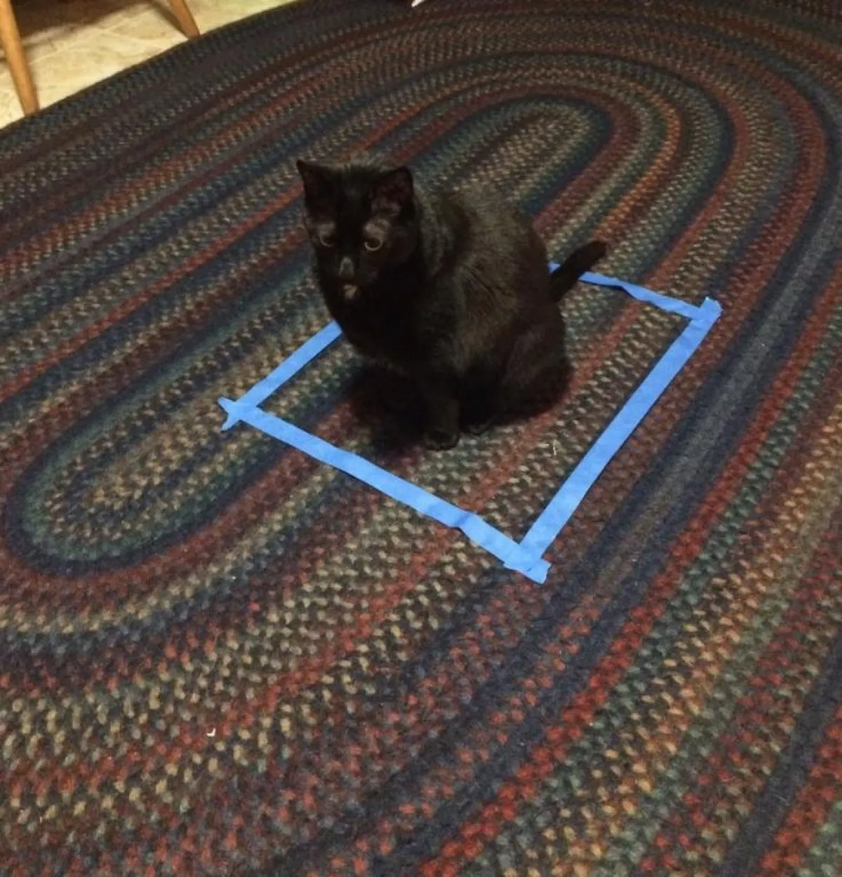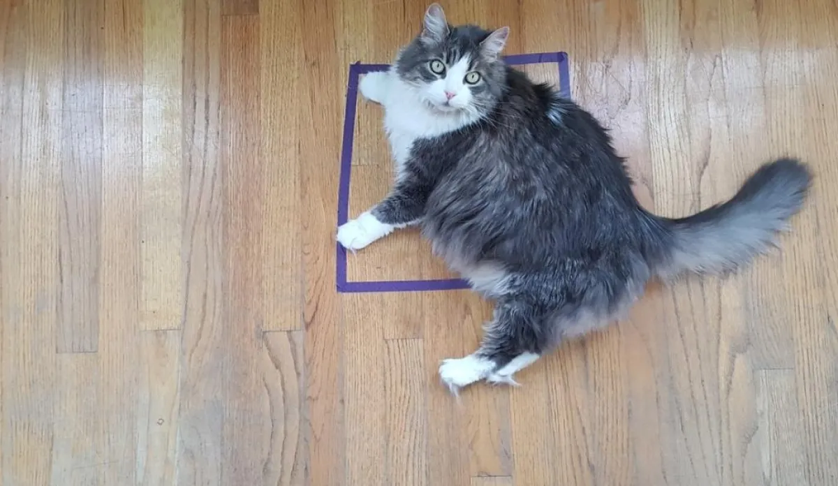 أجرى باحثون كنديون من جامعة University of Ottawa دراسة علمية عن السلوكيات الغريبة للقطط ورغبتها الدائمة في تكوير وحشر أجسامها في مساحاتٍ ضيقةٍ كعلب المقوى والصناديق الصغيرة والحقائب والخزانات الضيقة وحتى أكياس التسوق والزهريات ذات الفوهات الكبيرة. وقد صور الباحثون أفلام فيديو لقططٍ لا تستطيع مقاومة فكرة التكور داخل مربعات مرسومة بالشريط اللاصق أو الطباشير على الأرض، أو السجادة حيث تظهر كل قطة وهي تدور حول هذا المربع المرسوم، وتتردد قليلاً ولكنها تتجه في النهاية إليه وتكور جسمها داخله؛ لأنها ترى أن هذا المربع الوهمي قد يوفر لها شيئاً من الراحة النفسية والجسدية.
