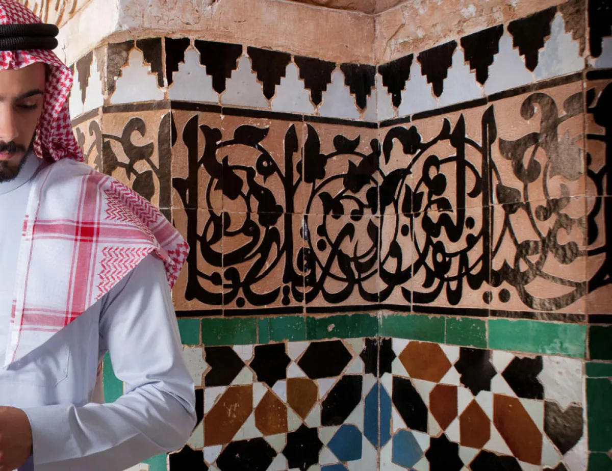 ويظهر دوج في الصورة باللونين الأبيض والأسود، وهو يلبس الشماغ والعقال.