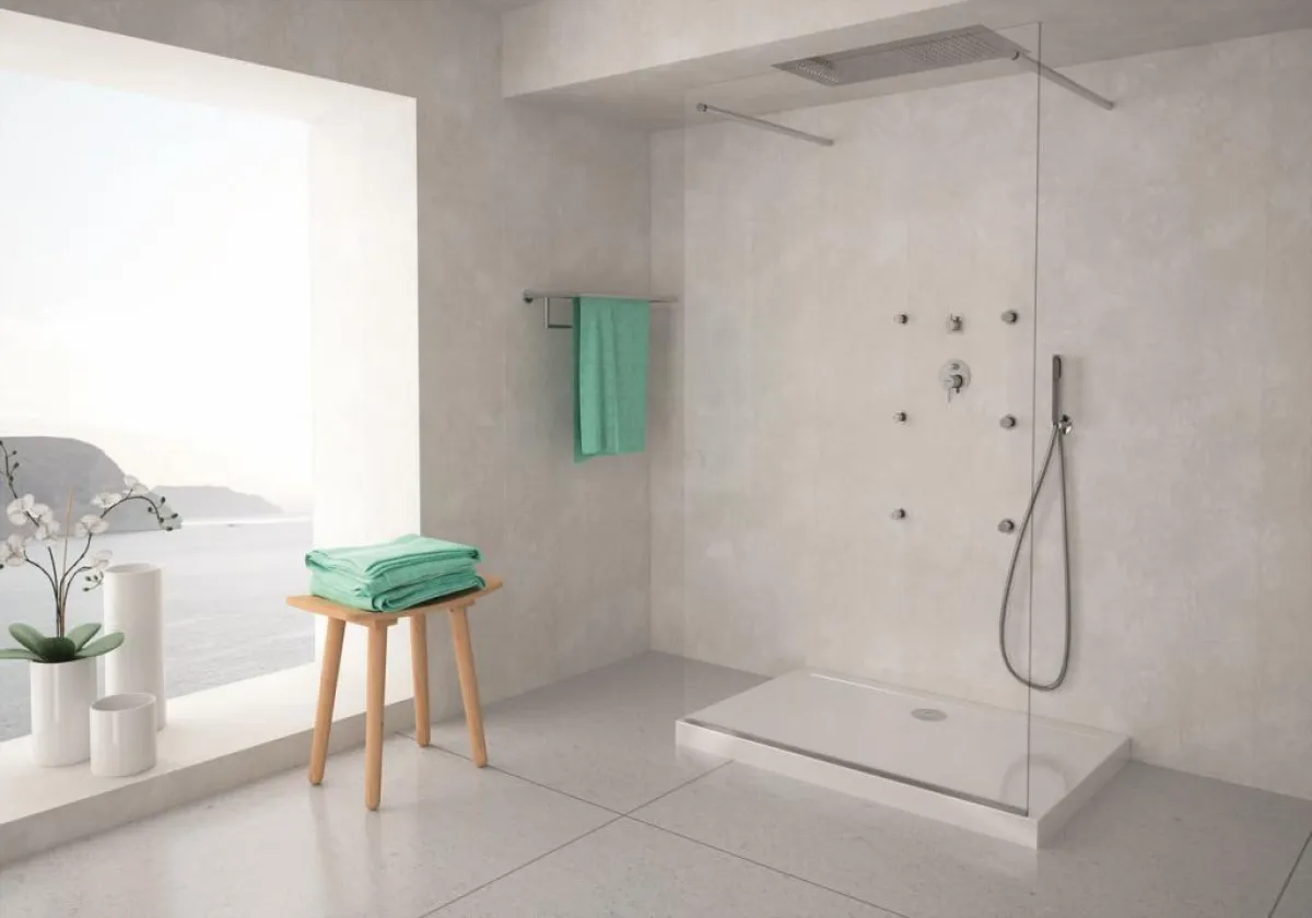7. تُحدّد إحدى جهات المكان الخاص بالـ"دش" بالزجاج، وتترك مفتوحة من جهة أخرى، ما يسمح بحريّة الحركة. كما تُحدّد مساحة حوض الاستحمام بواسطة الخشب.