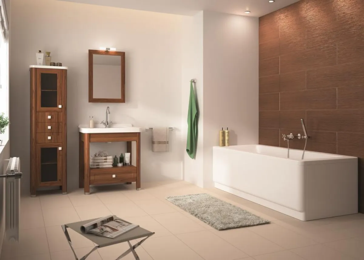2. بعد أن كانت جدران الحمّام متشابهة من قبل، يدعو النمط الرائج أخيرًا إلى تمييز جدار من بينها في تصميمه عن الأخرى. وبعد أن كانت مقاسات بلاط الأرضيّة والجدران متناغمة، أمست تختلف اليوم ما بين السقف والأرضيّة.