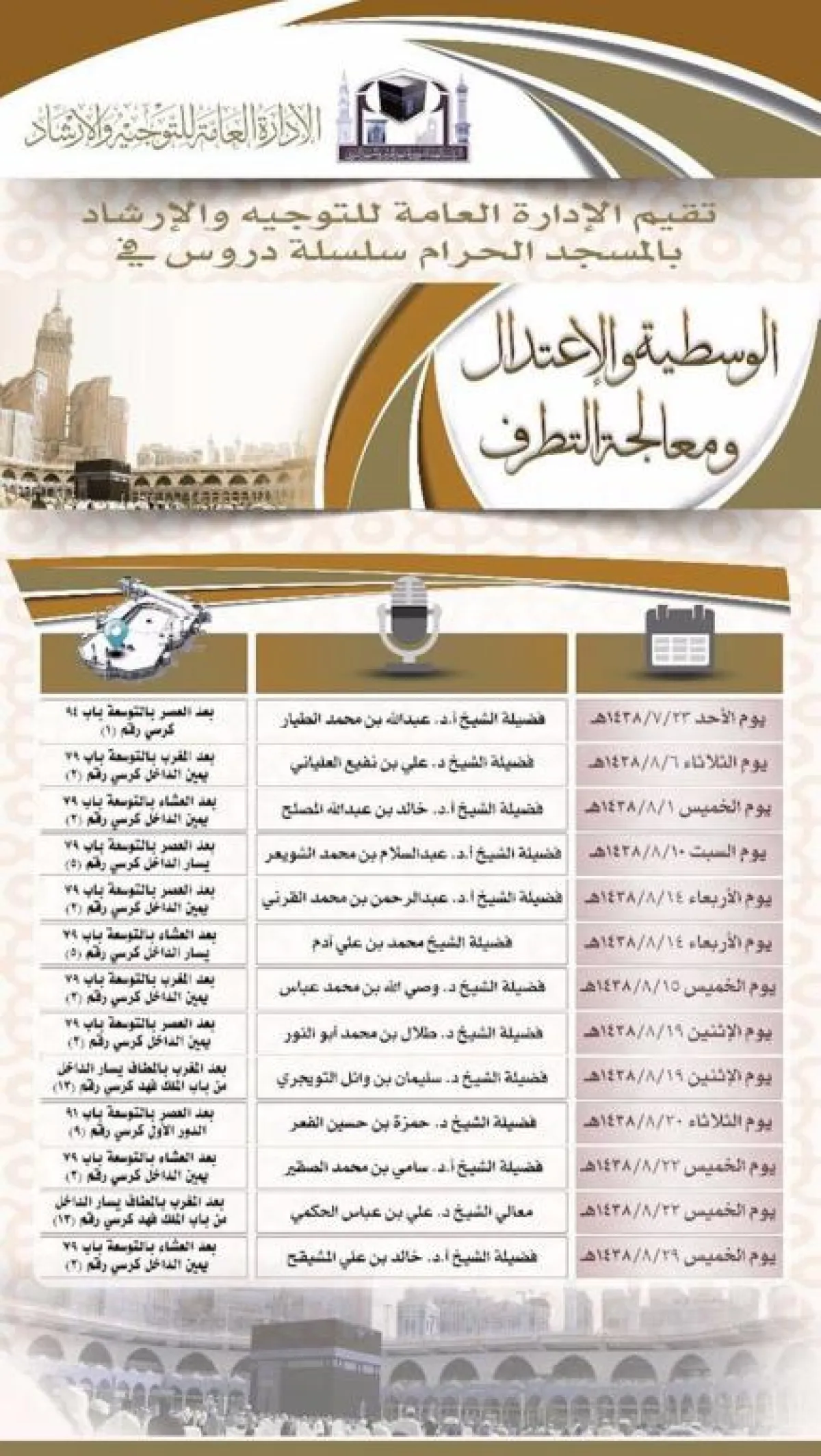 أعلنت الرئاسة العامة لشؤون المسجد الحرام والمسجد النبوي، ممثلة في الإدارة العامة للتوجيه والإرشاد بالمسجد الحرام، عن جدول الدروس العلمية بعنوان (الوسطية والاعتدال ومعالجة التطرف) بالمسجد الحرام لشهر شعبان، والتي تحرص الرئاسة من خلالها على تعليم وتوعية روّاد بيت الله العتيق، أوضح ذلك فضيلة مدير الإدارة العامة للتوجيه والإرشاد الشيخ صالح المقوشي.