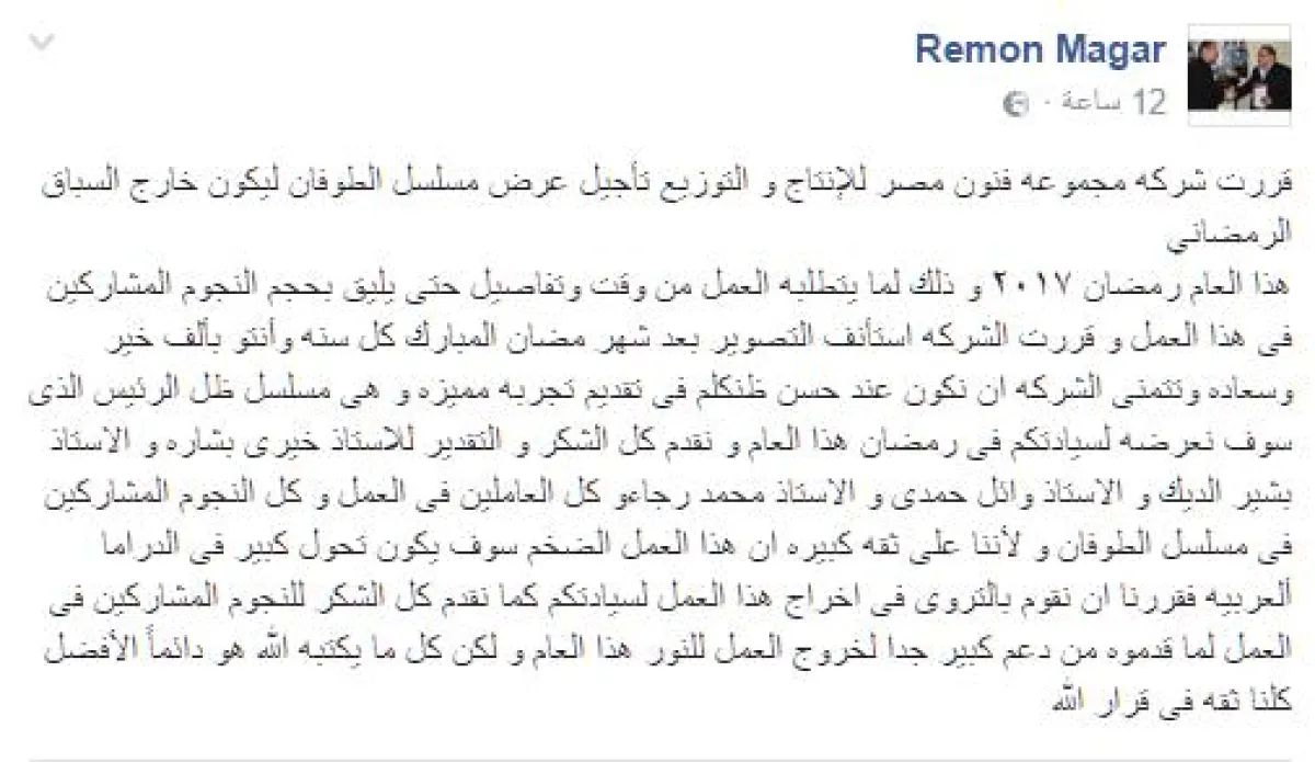 البيان الرسمي للمنتج ريمون مقار جاء فيه: قررت شركه مجموعه فنون مصر للإنتاج و التوزيع تأجيل عرض مسلسل الطوفان ليكون خارج السباق الرمضاني هذا العام رمضان ٢٠١٧ و ذلك لما يتطلبه العمل من وقت وتفاصيل حتى يليق بحجم النجوم المشاركين في هذا العمل و قررت الشركة استئنانف التصوير بعد شهر مضان المبارك كل سنه وأنتم بألف خير وسعادة.