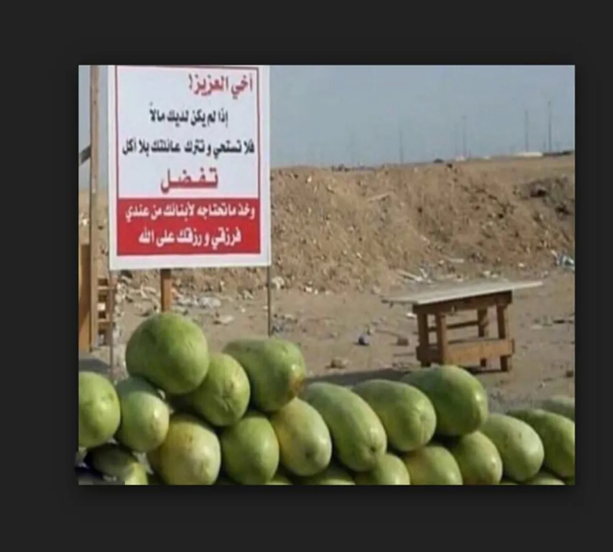 وعلَّق البائع لافتة إلى جانب بضاعته، كتب عليها: "إذا لم يكن لديك مالٌ فلا تستحي وتترك عائلتك بلا أكل، تفضل وخذ ما تحتاج إليه، فرزقي ورزقك على الله".